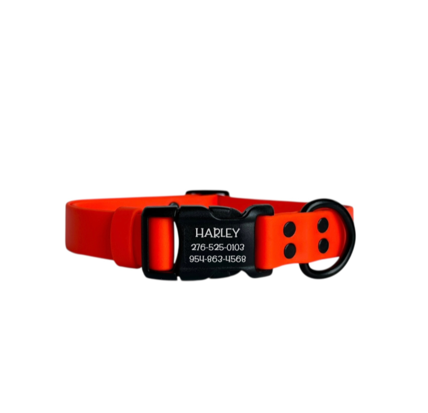 Features: adjustable dog collar made with Biothane®, side release buckle, tri-glide, rivets, and welded d-ring.