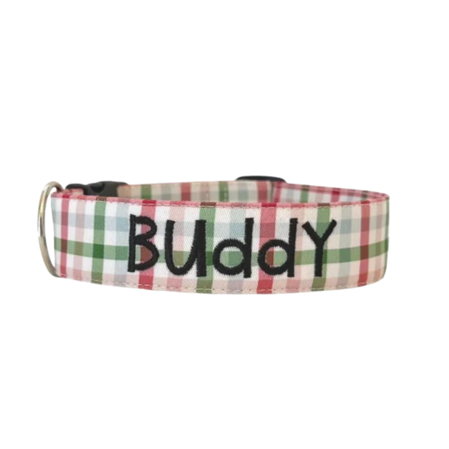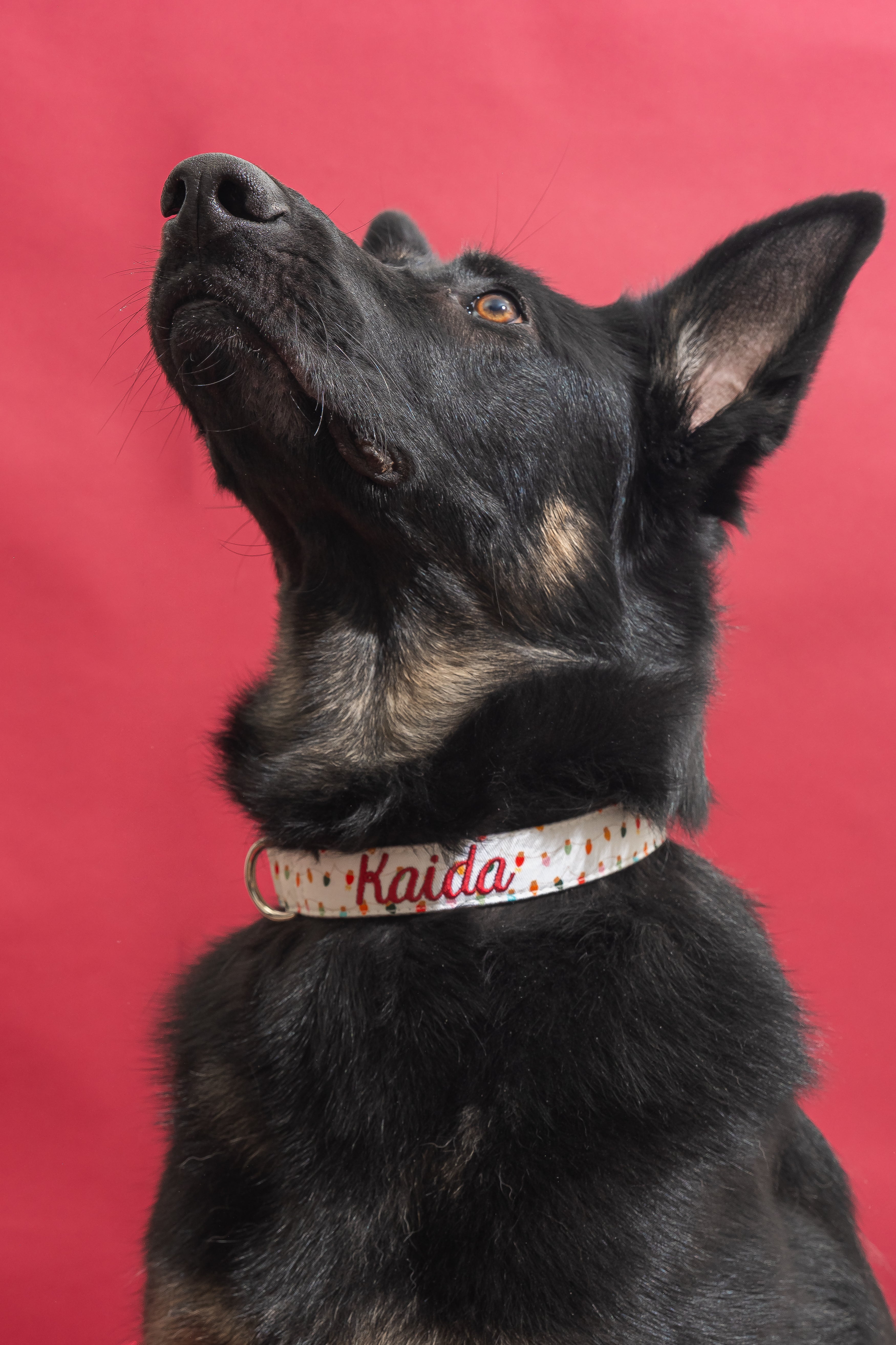All of our dog collars are handmade in house with care & high quality materials. They are strong, durable, machine washable, and if chosen, personalized.