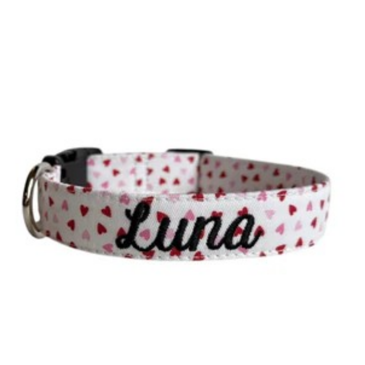 All of our dog collars are handmade in house with care & high quality materials. They are strong, durable, machine washable, and if chosen, personalized.
