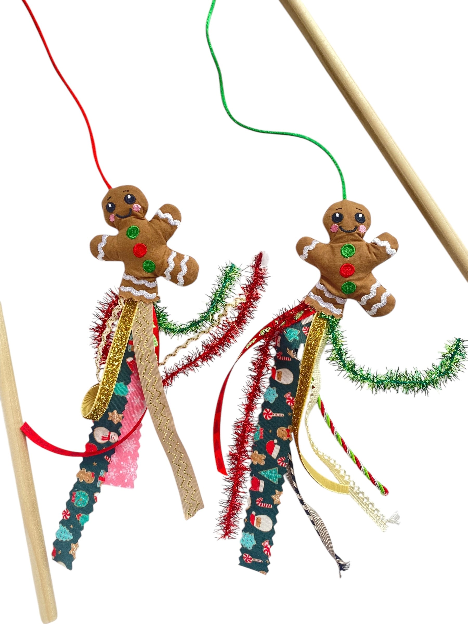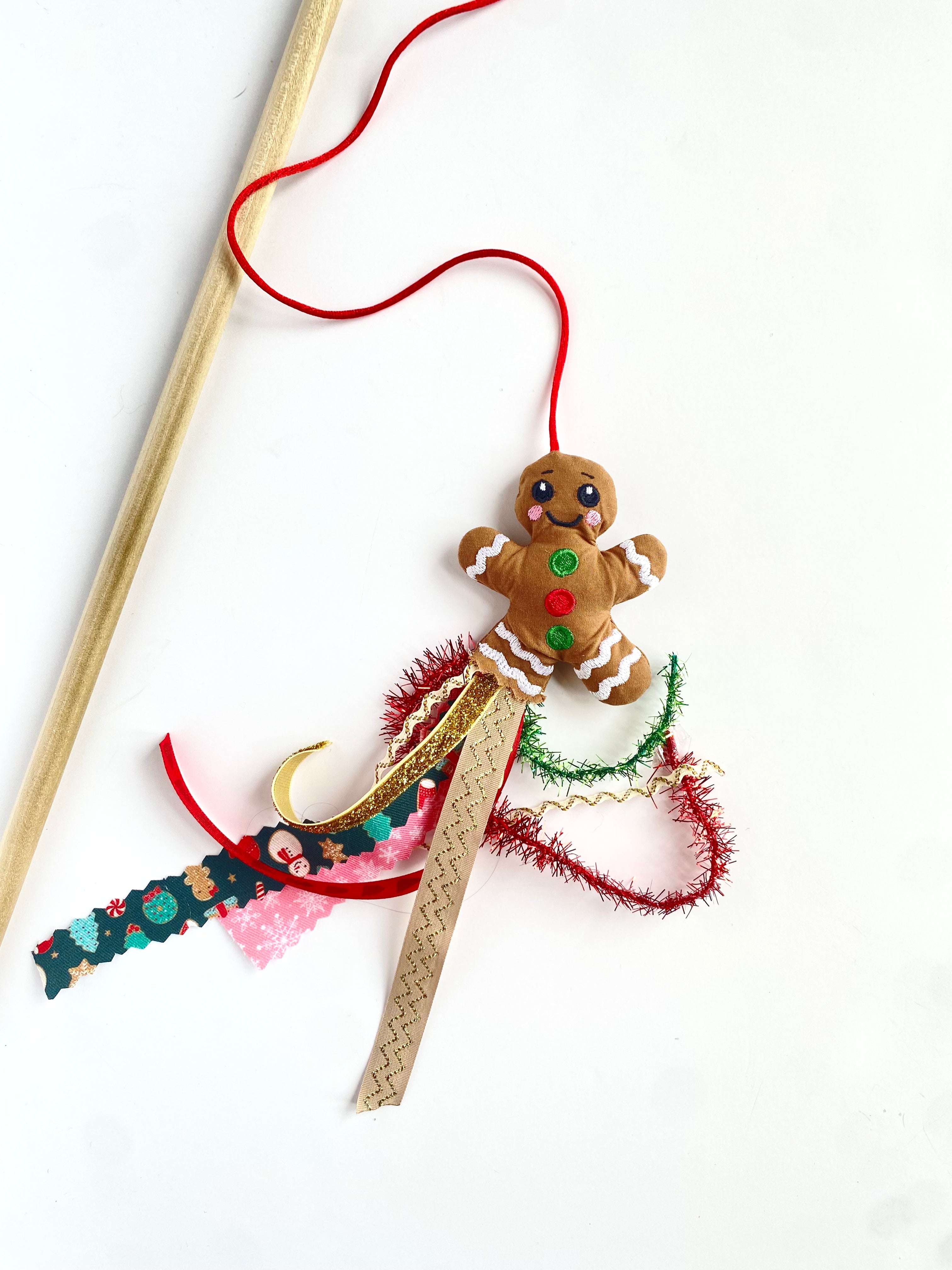 The custest cat toy for Christmas! Keep your kitten busy. We make these little mice from embroidered fabric and a variety of ribbons, no two are the same. The sticks are roughly 2 feet with an estimated 3 feet of string to keep your cat happy. The little gingerbread man is stuffed with a tad of catnip and are reinforced to last.
