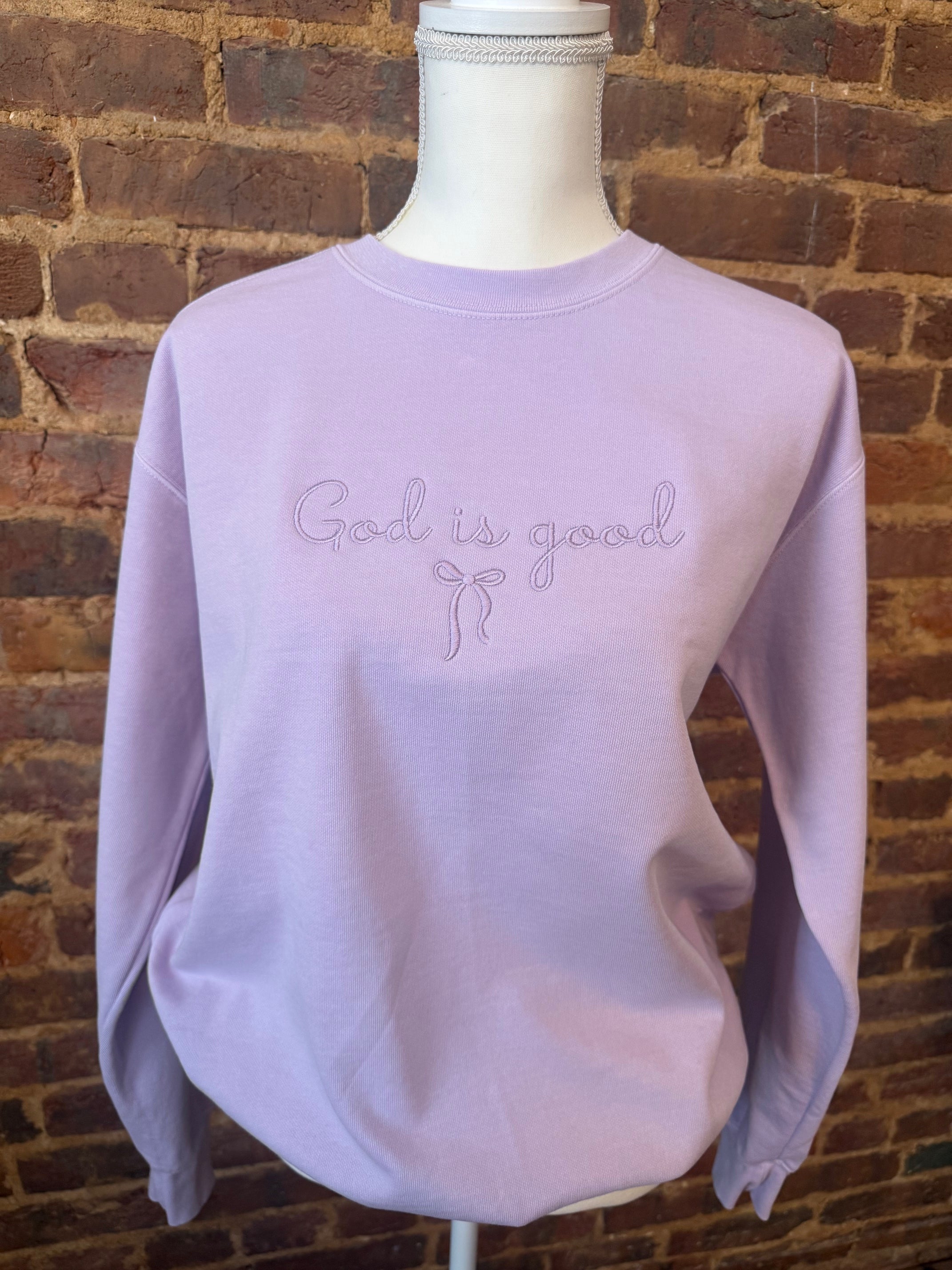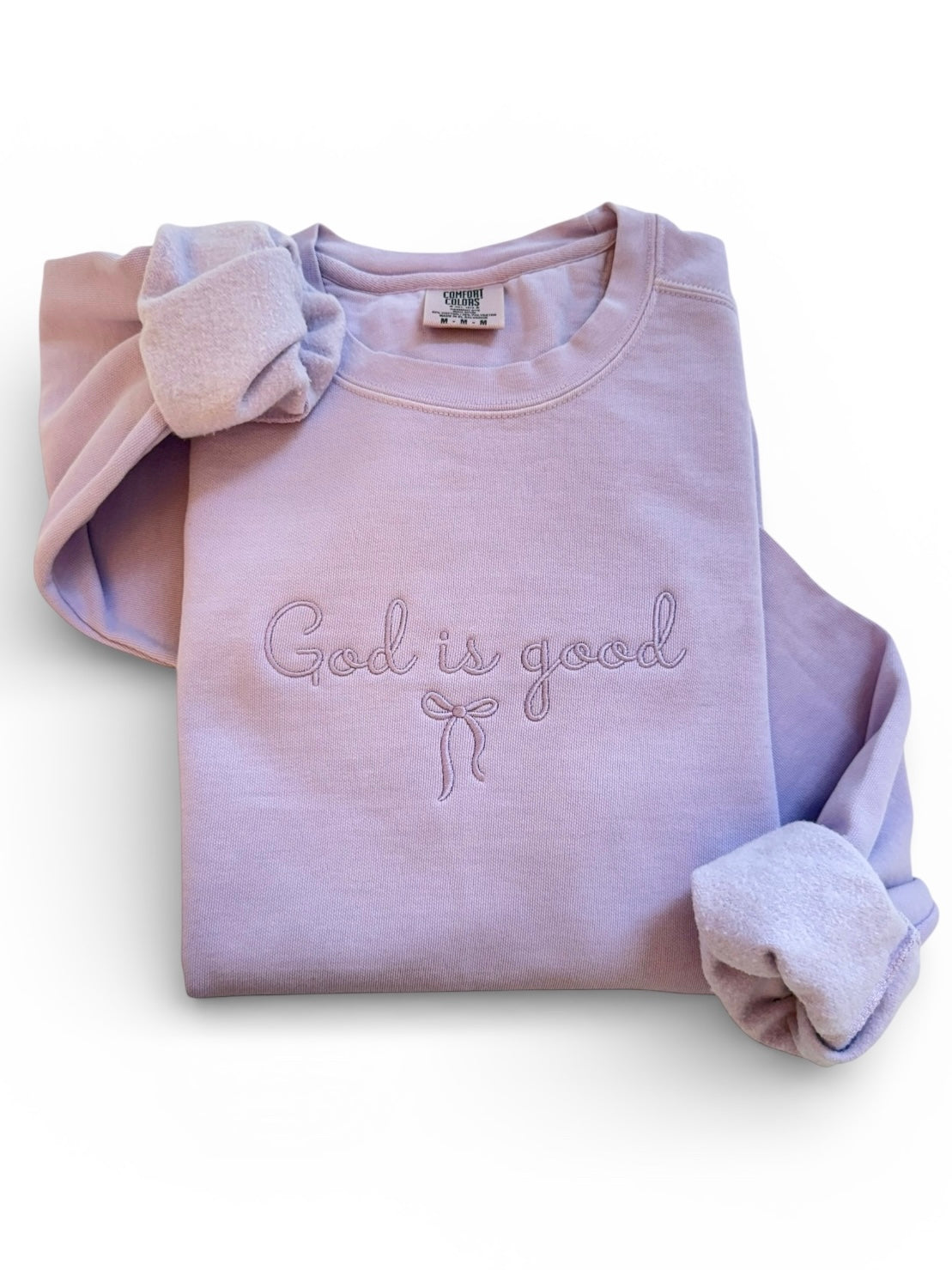 Cozy, timeless, and faith-inspired—this Comfort Colors® sweatshirt in your color choice is the perfect blend of comfort and meaning. Made from garment-dyed cotton for that relaxed, lived-in feel, it features God is Good embroidered in tone on tone thread.