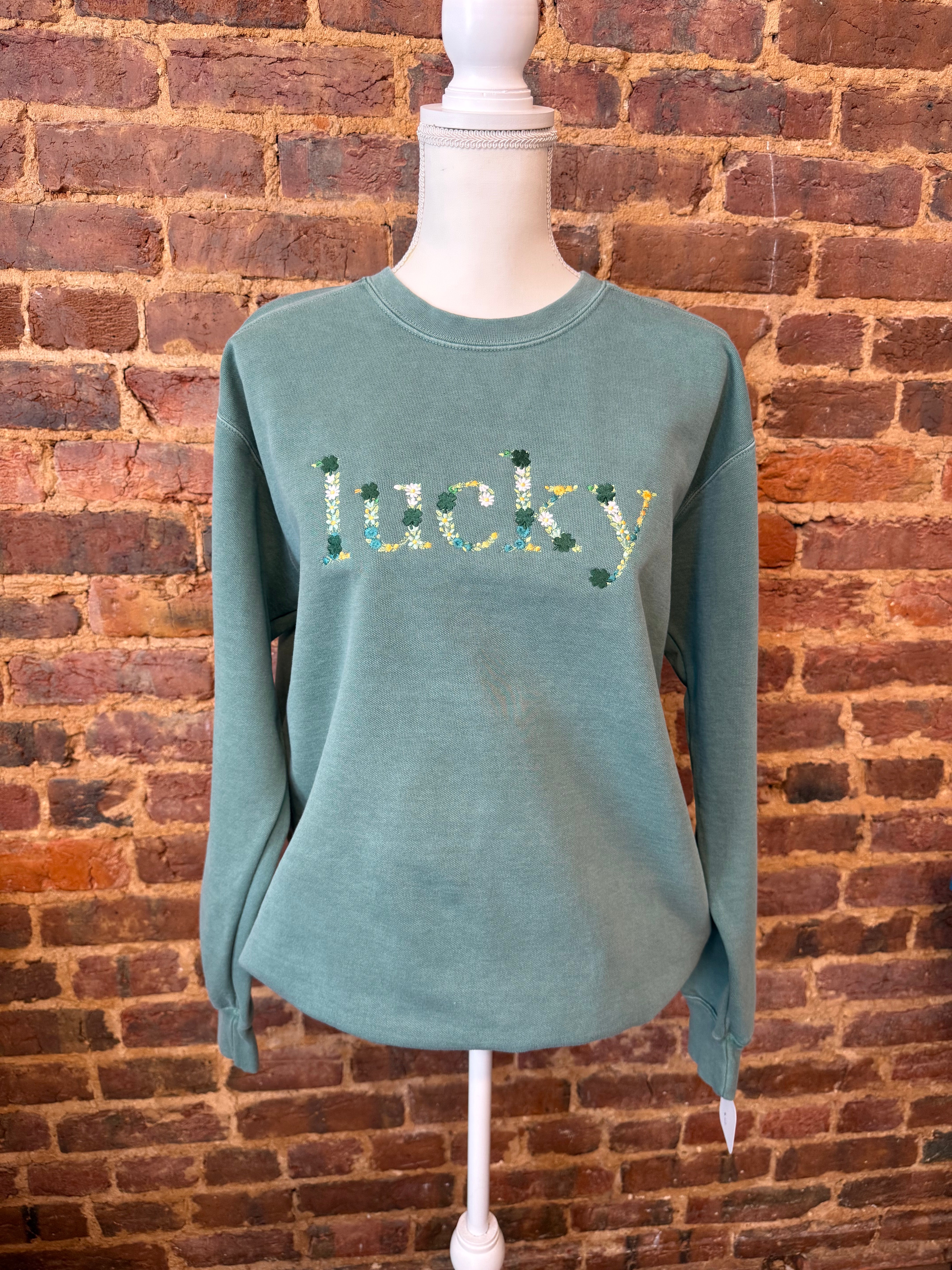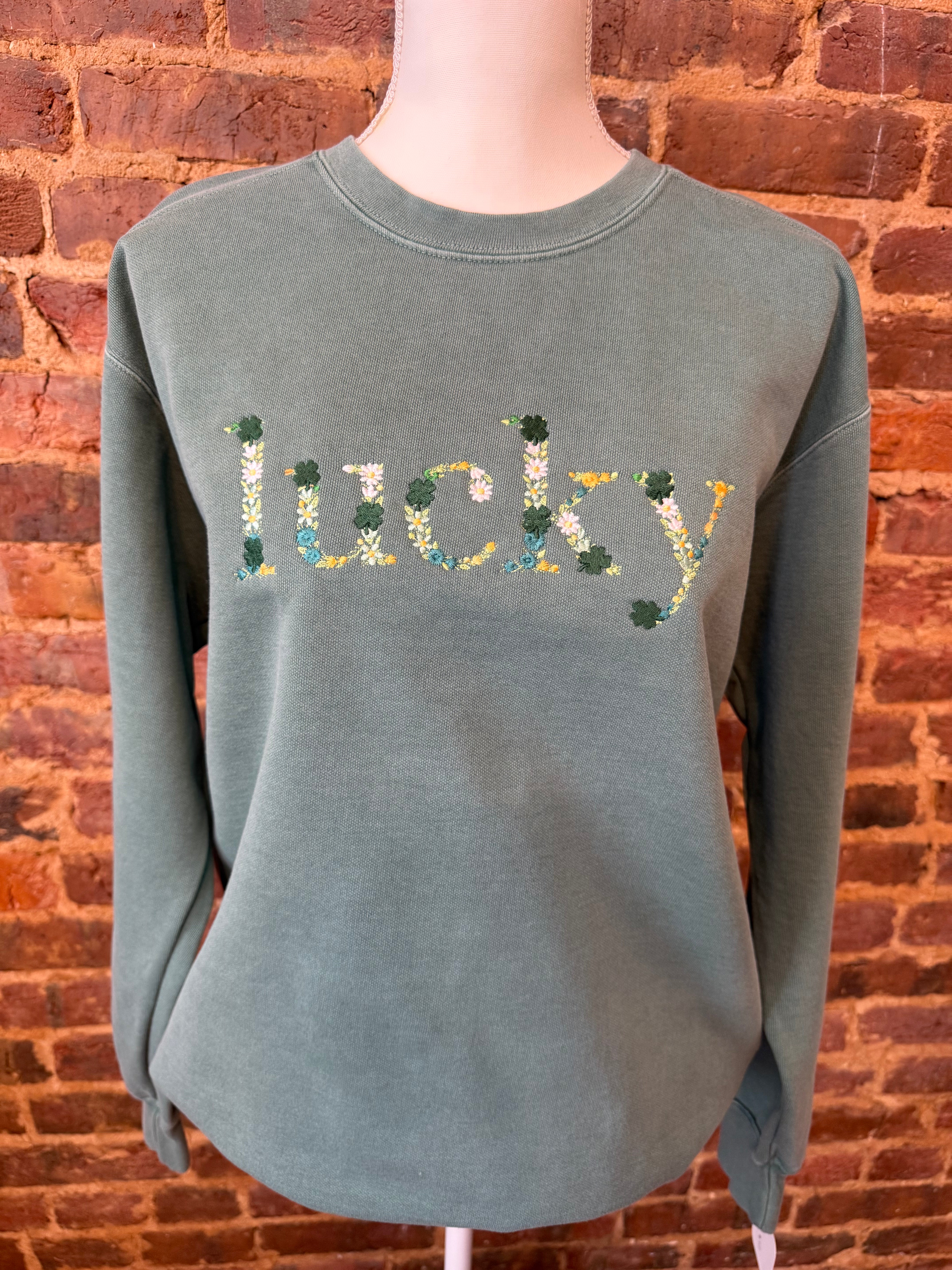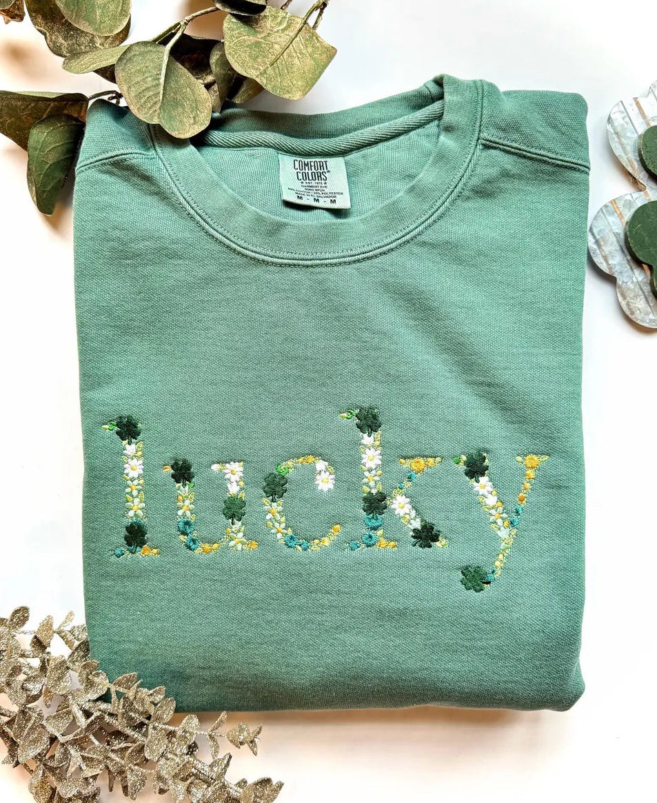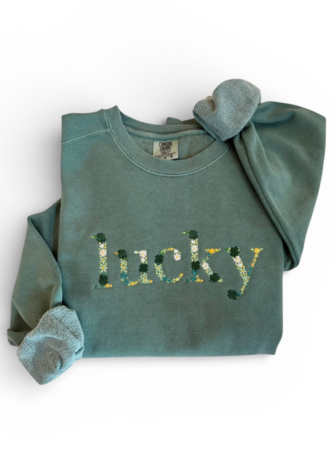 Celebrate a little extra luck this season with our St. Patrick’s Day “Lucky” Embroidered Sweatshirt. Made on a cozy Comfort Colors® crewneck, this sweatshirt features a soft, vintage-washed green tone and beautifully detailed floral embroidery spelling out lucky. The relaxed fit and heavyweight feel make it perfect for chilly March days, parades, or casual spring wear. Thoughtfully stitched and effortlessly festive, it’s a timeless piece you’ll reach for long after St. Patrick’s Day.