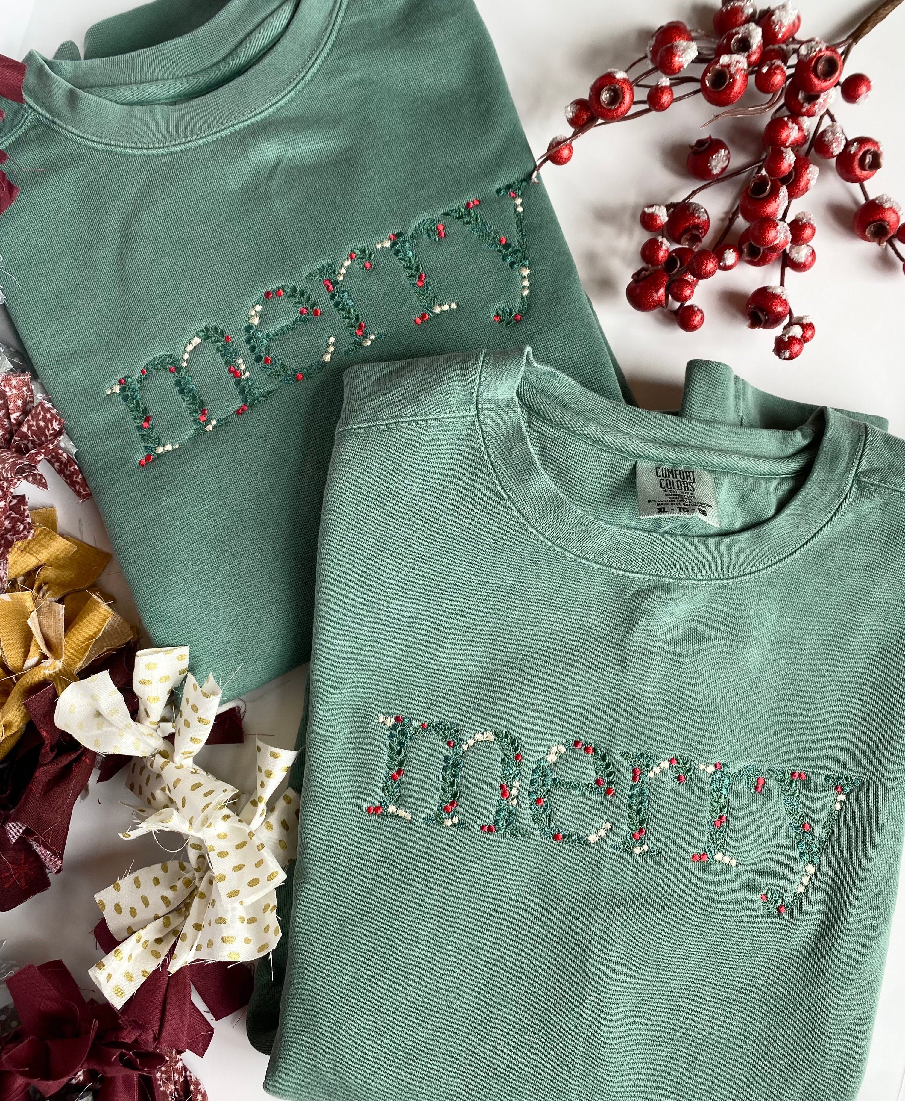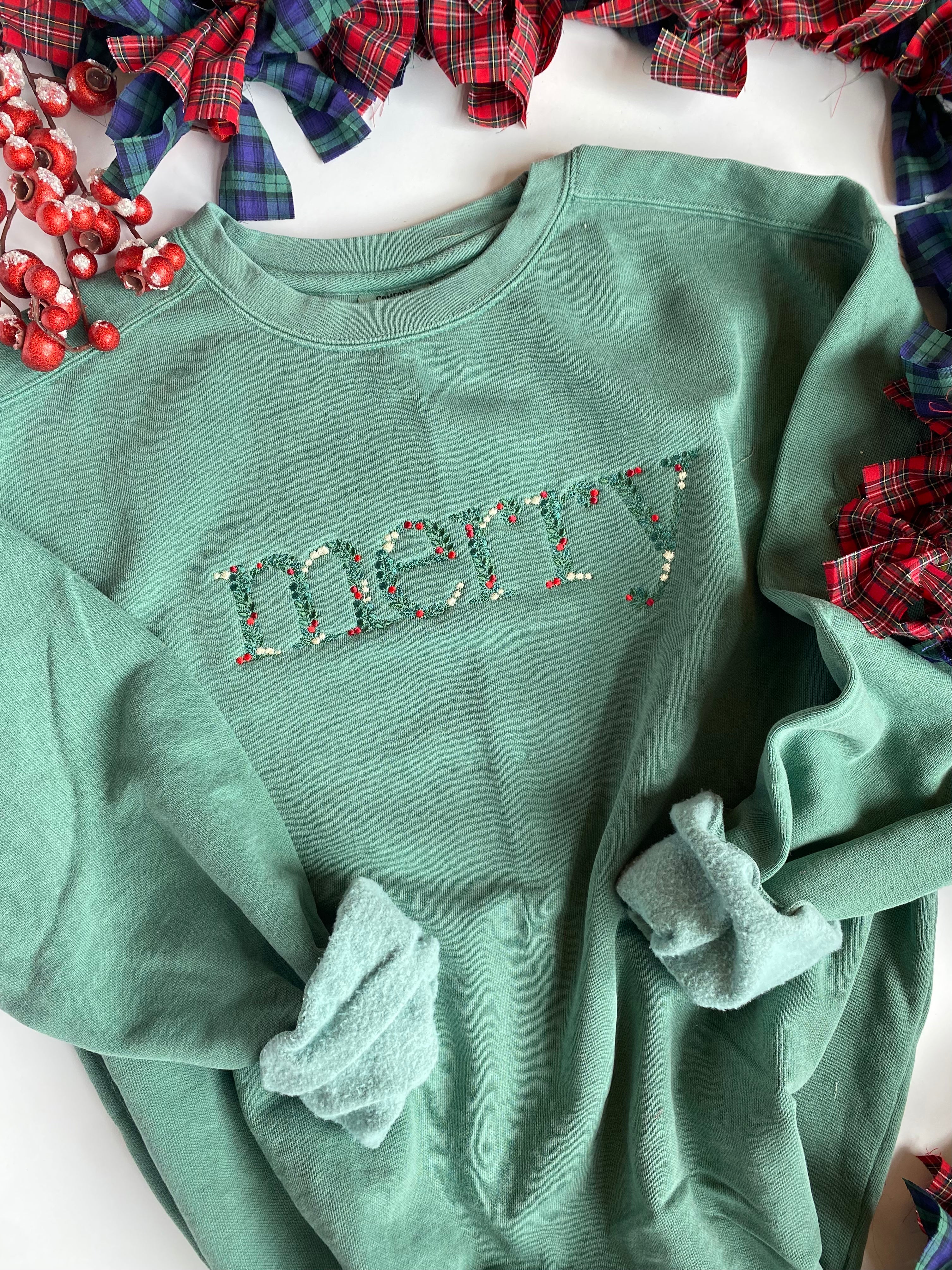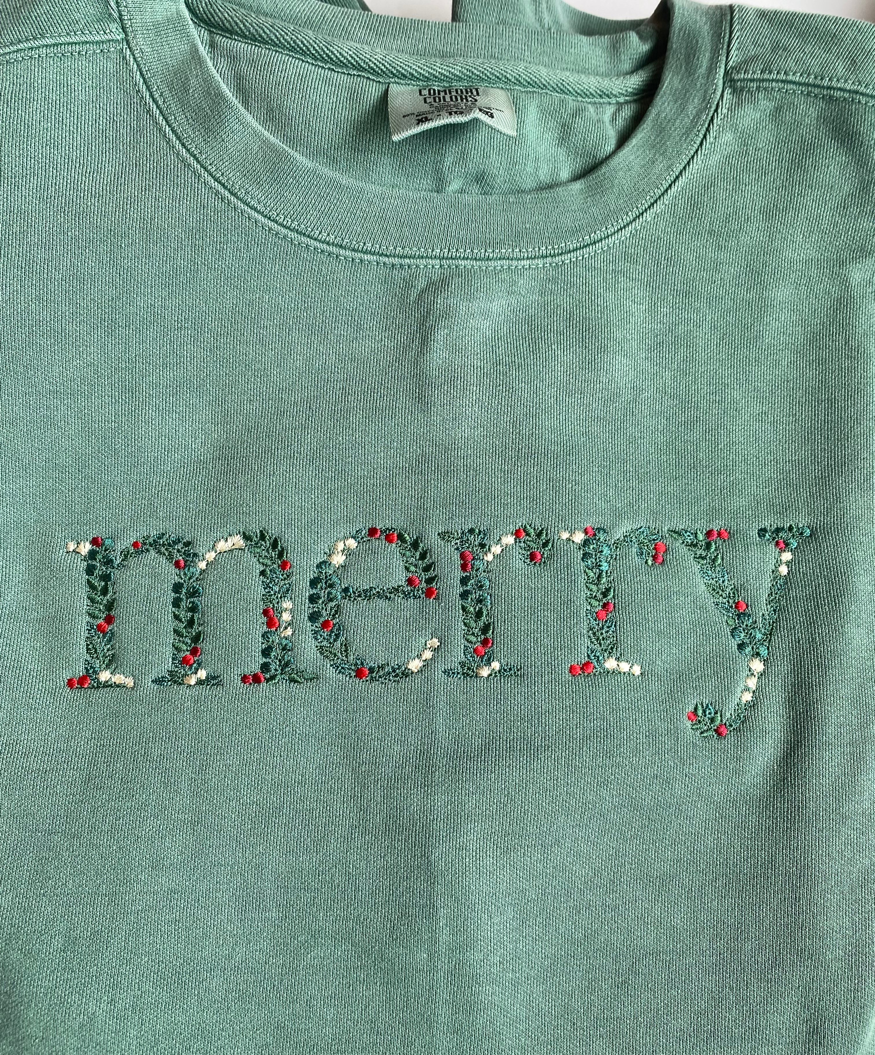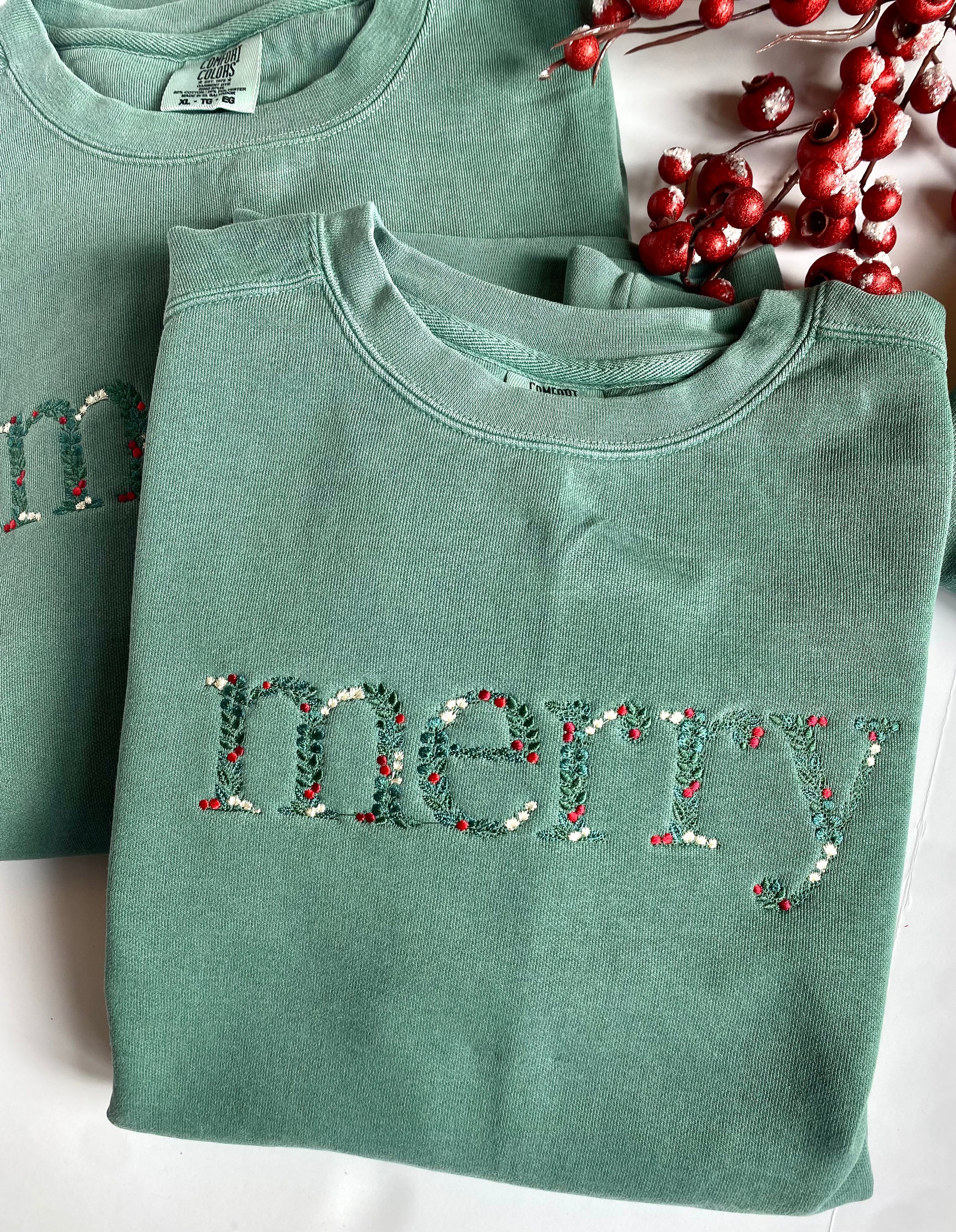 Our Merry Comfort Color sweatshirt combines cozy comfort with a personalized touch that everyone will love. Crafted from soft, high-quality fabric, this sweatshirt features a beautiful, custom embroidery design that spells "merry." The relaxed fit and ribbed cuffs provide all-day comfort, making it perfect for running errands, lounging at home, or enjoying casual outings.