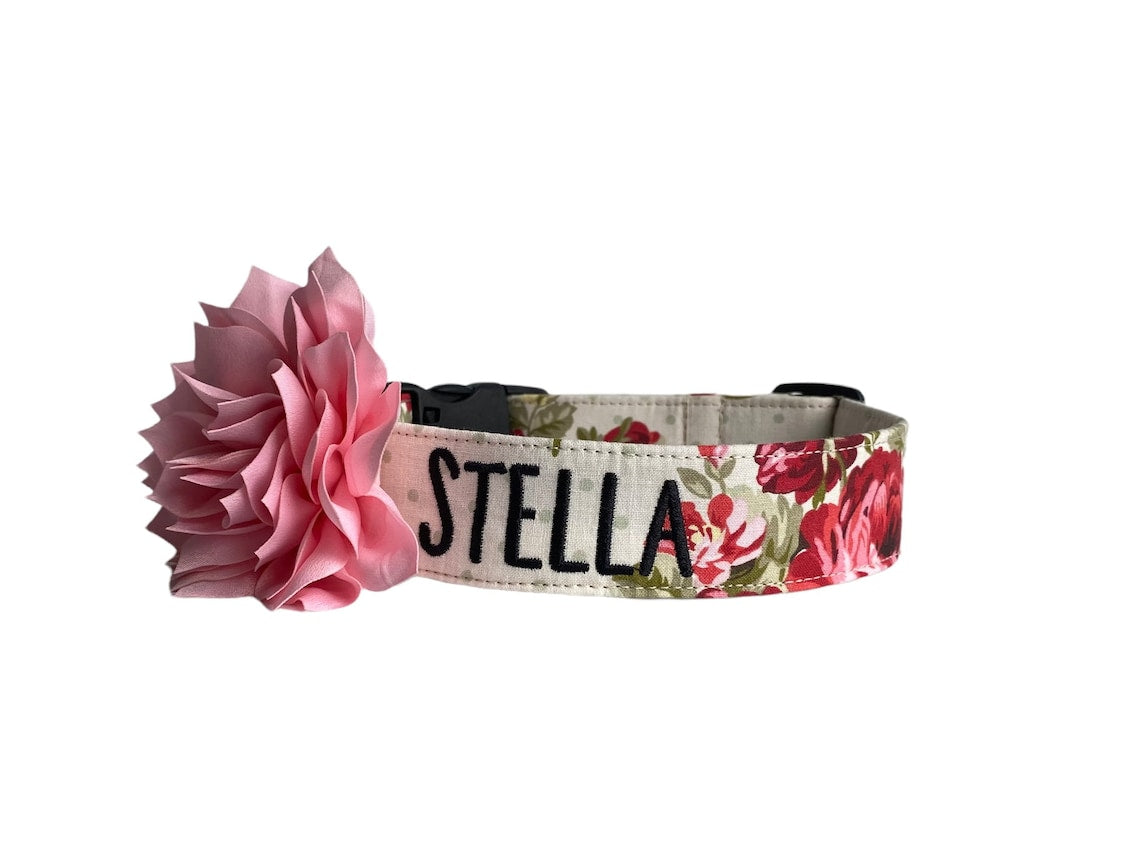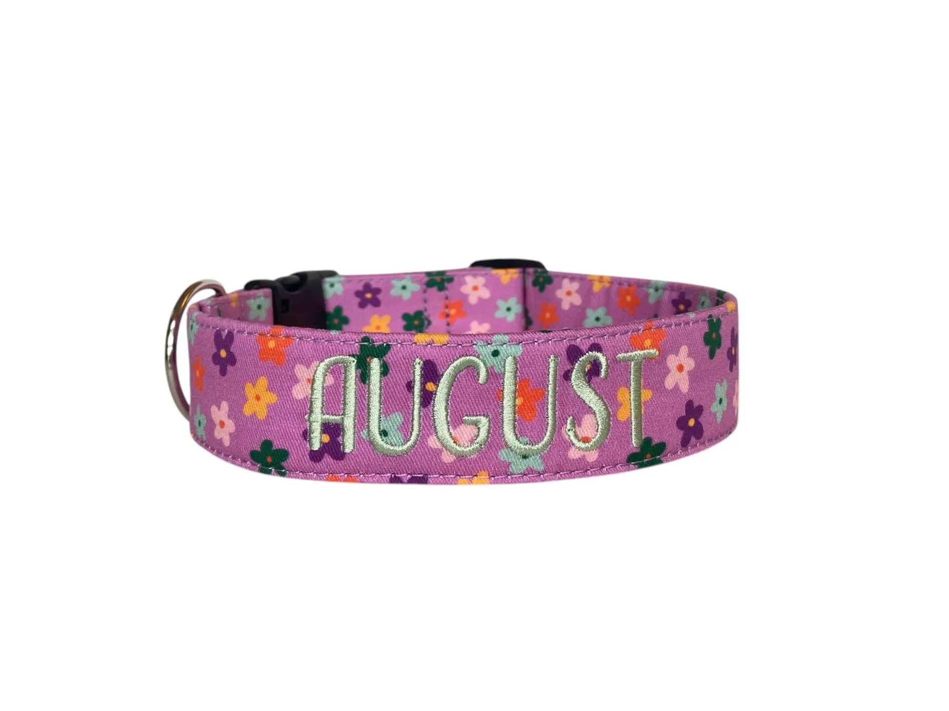 Our personalized embroidered dog collars are head turners! Our designer fabrics paired with your choice of font and thread color make for a great personalized and unique dog collar that shows their personality. Our embroidered dog collars also offer the option to be completed with an engraved buckle which offers more of that personal touch and also safety. Duke & Fox® custom dog collars are perfect for all dog breeds and come in a large variety of sizes. We also have matching collar accessories including leashes, bowties, flowers, and harnesses.