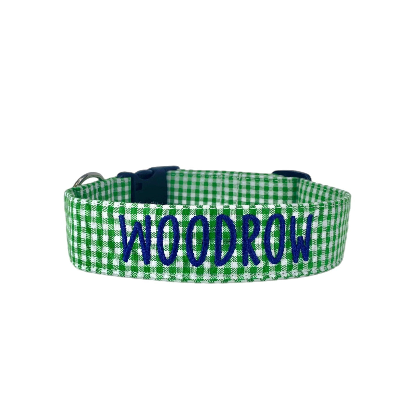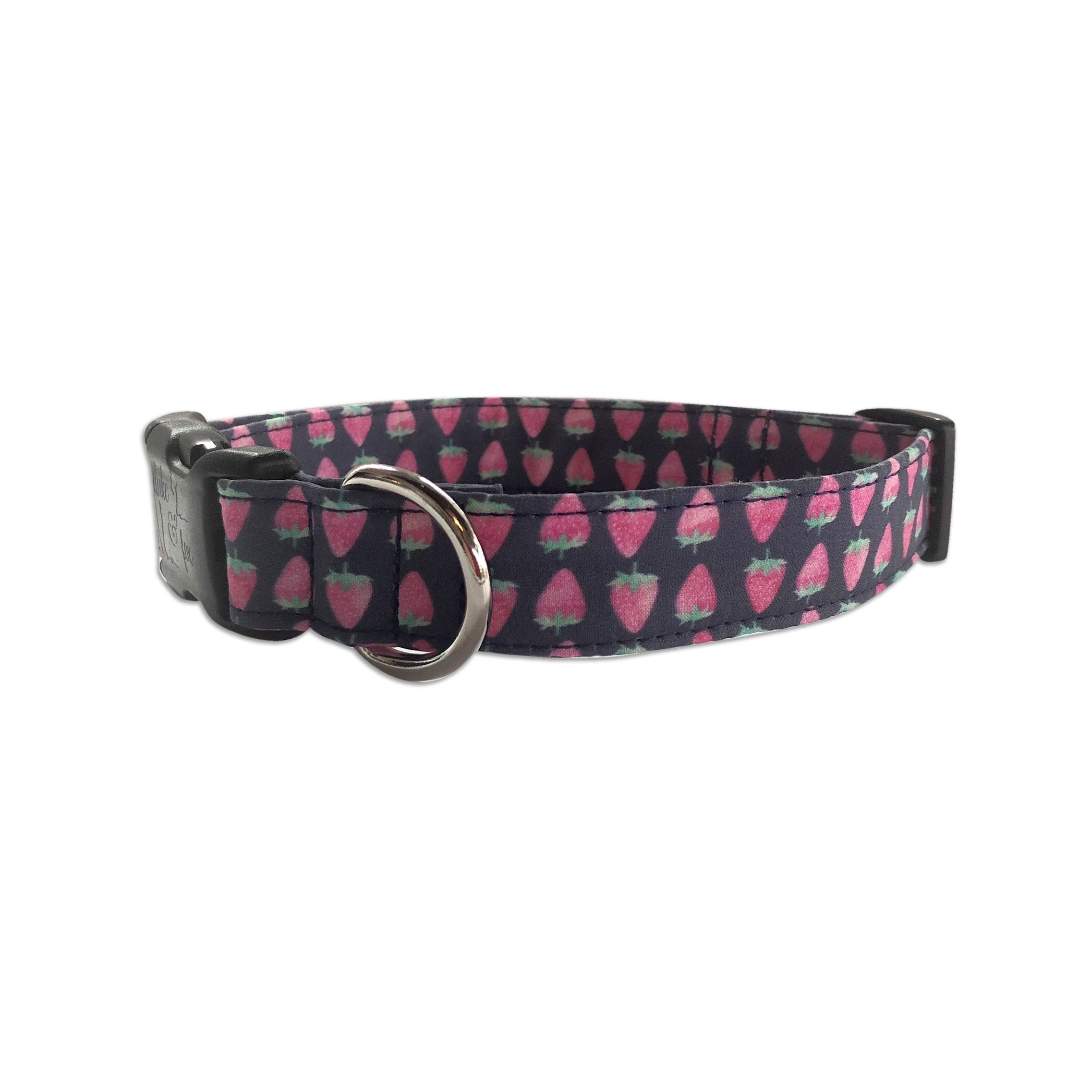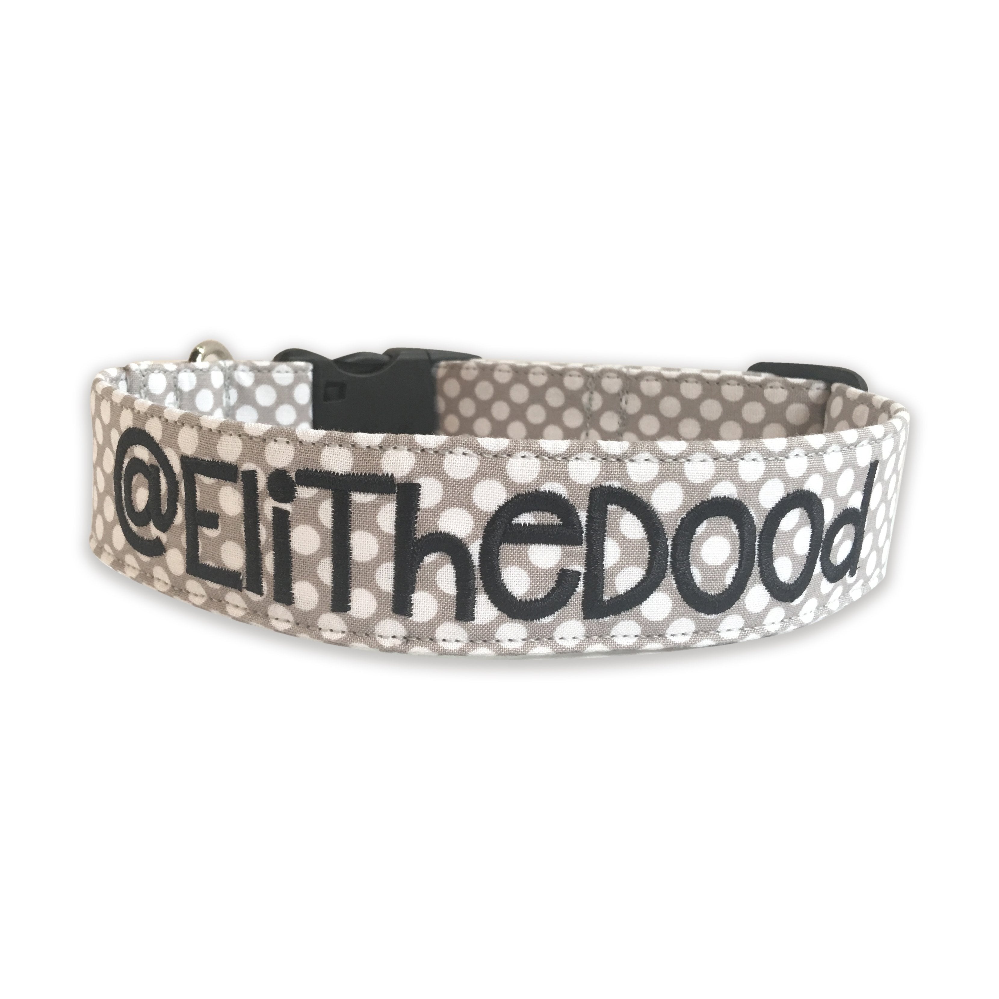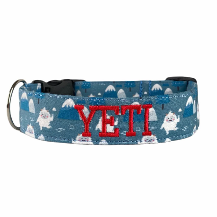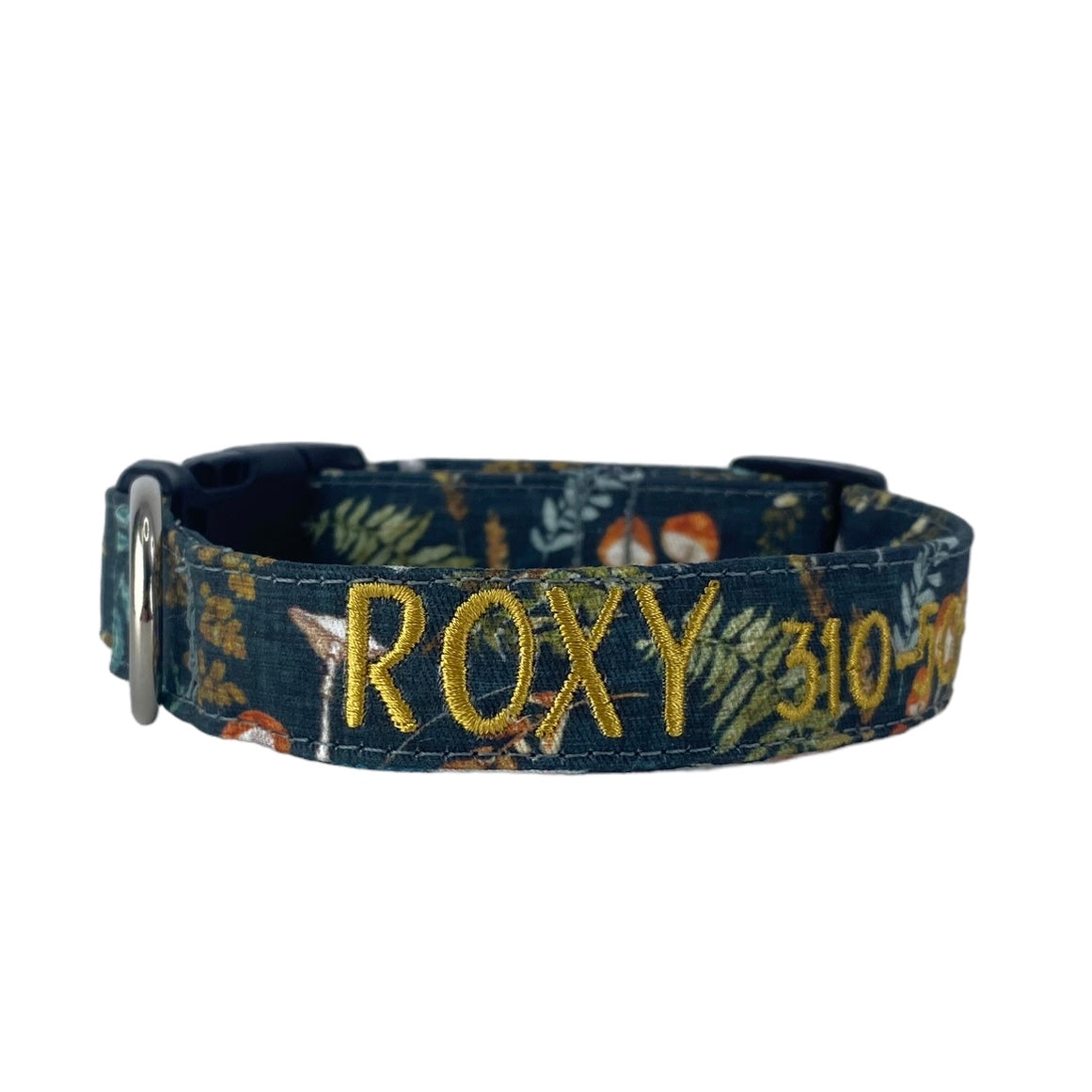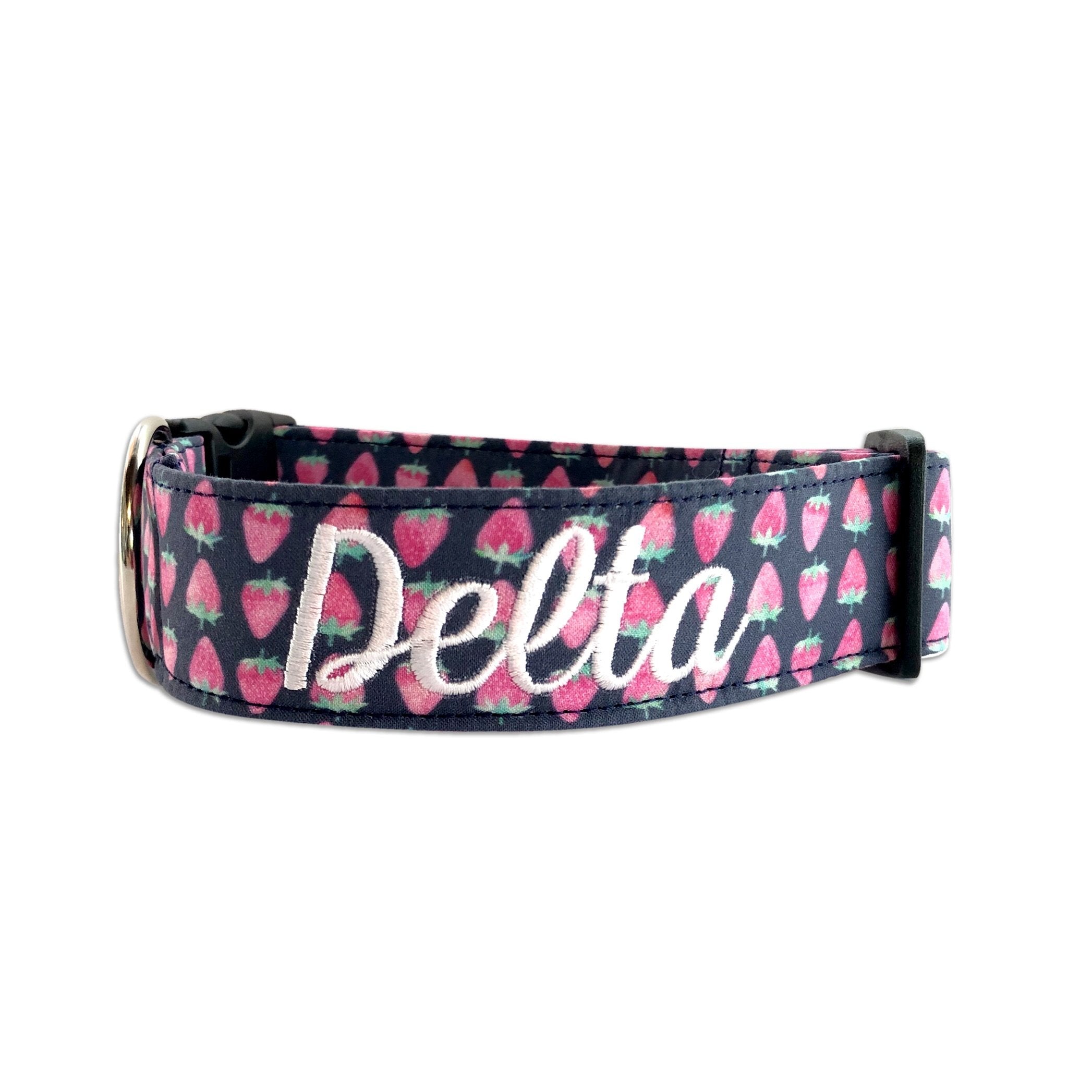 Our personalized embroidered dog collars are head turners! Our designer fabrics paired with your choice of font and thread color make for a great personalized and unique dog collar that shows their personality. Our embroidered dog collars also offer the option to be completed with an engraved buckle which offers more of that personal touch and also safety. Duke & Fox® custom dog collars are perfect for all dog breeds and come in a large variety of sizes. We also have matching collar accessories including leashes, bowties, flowers, and harnesses.