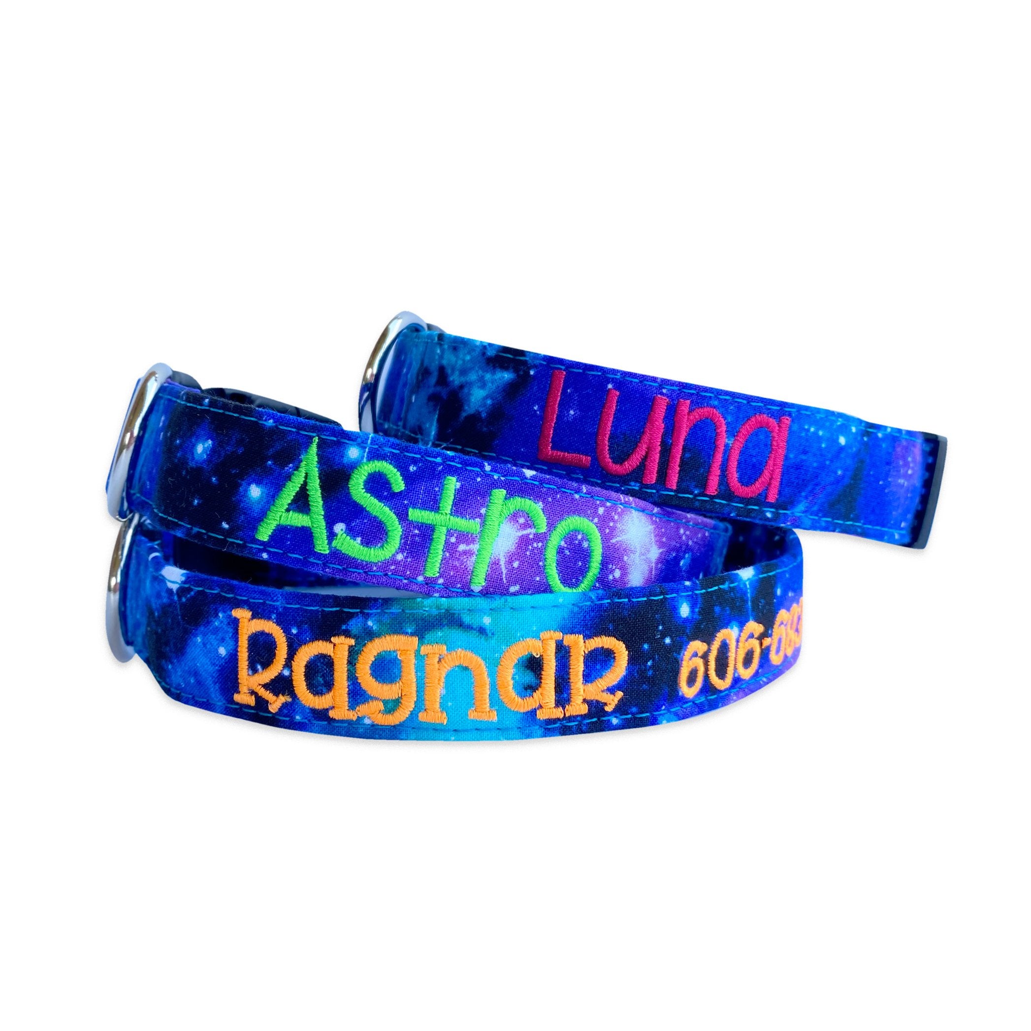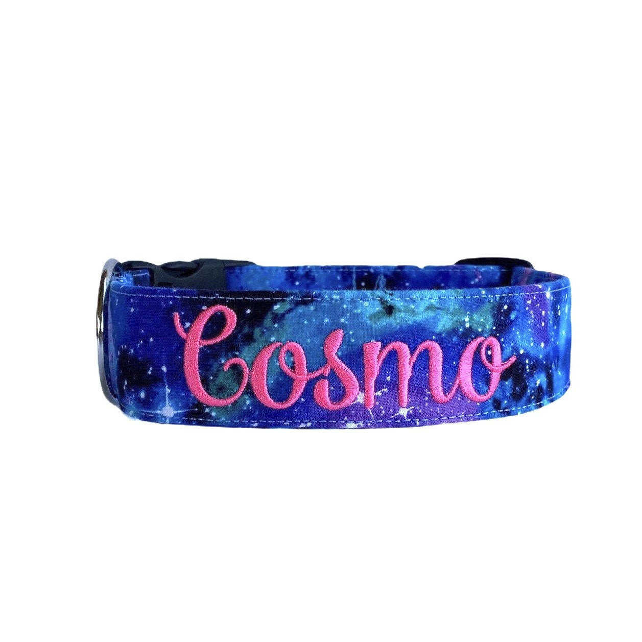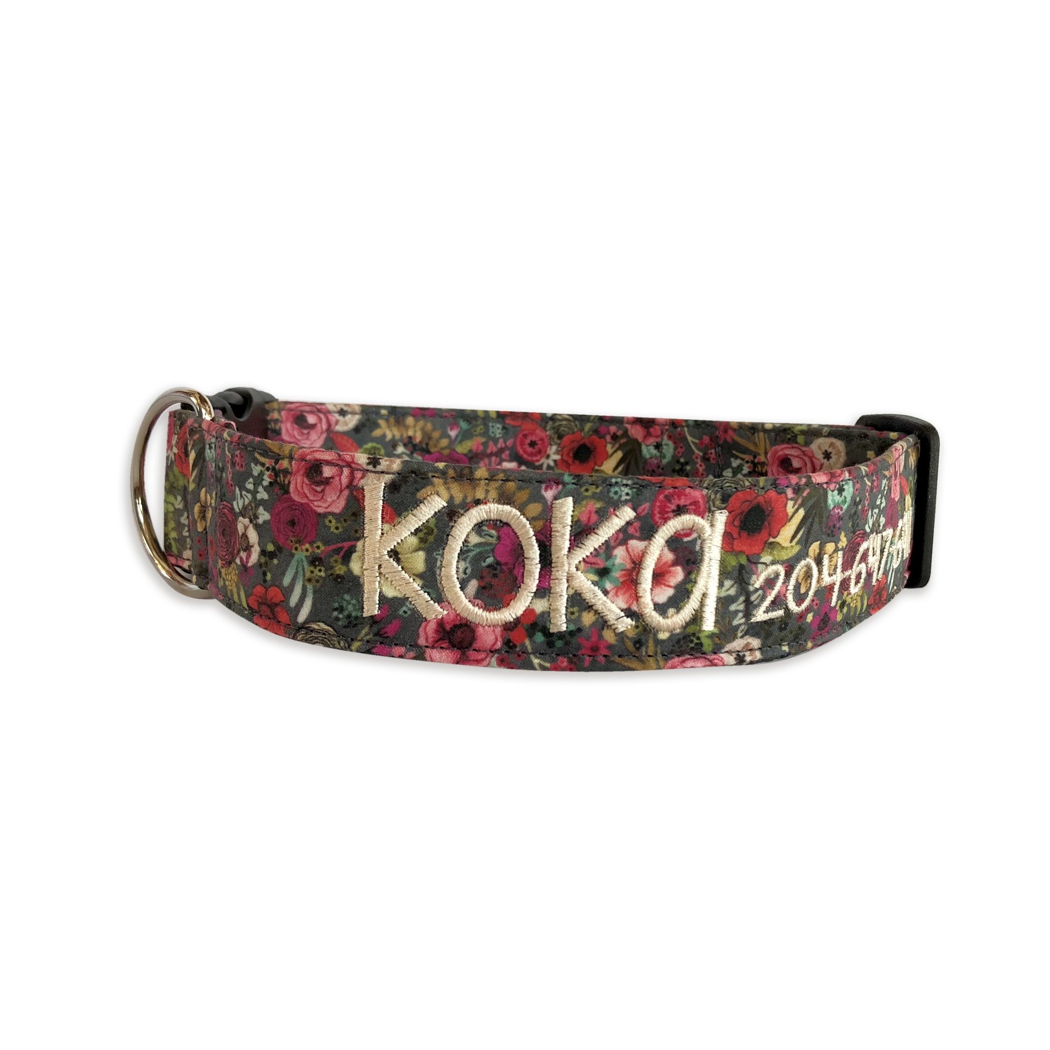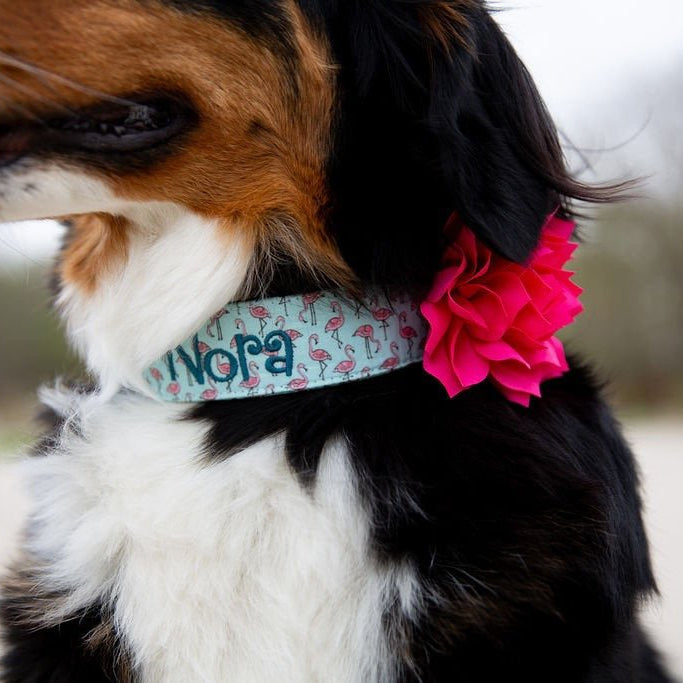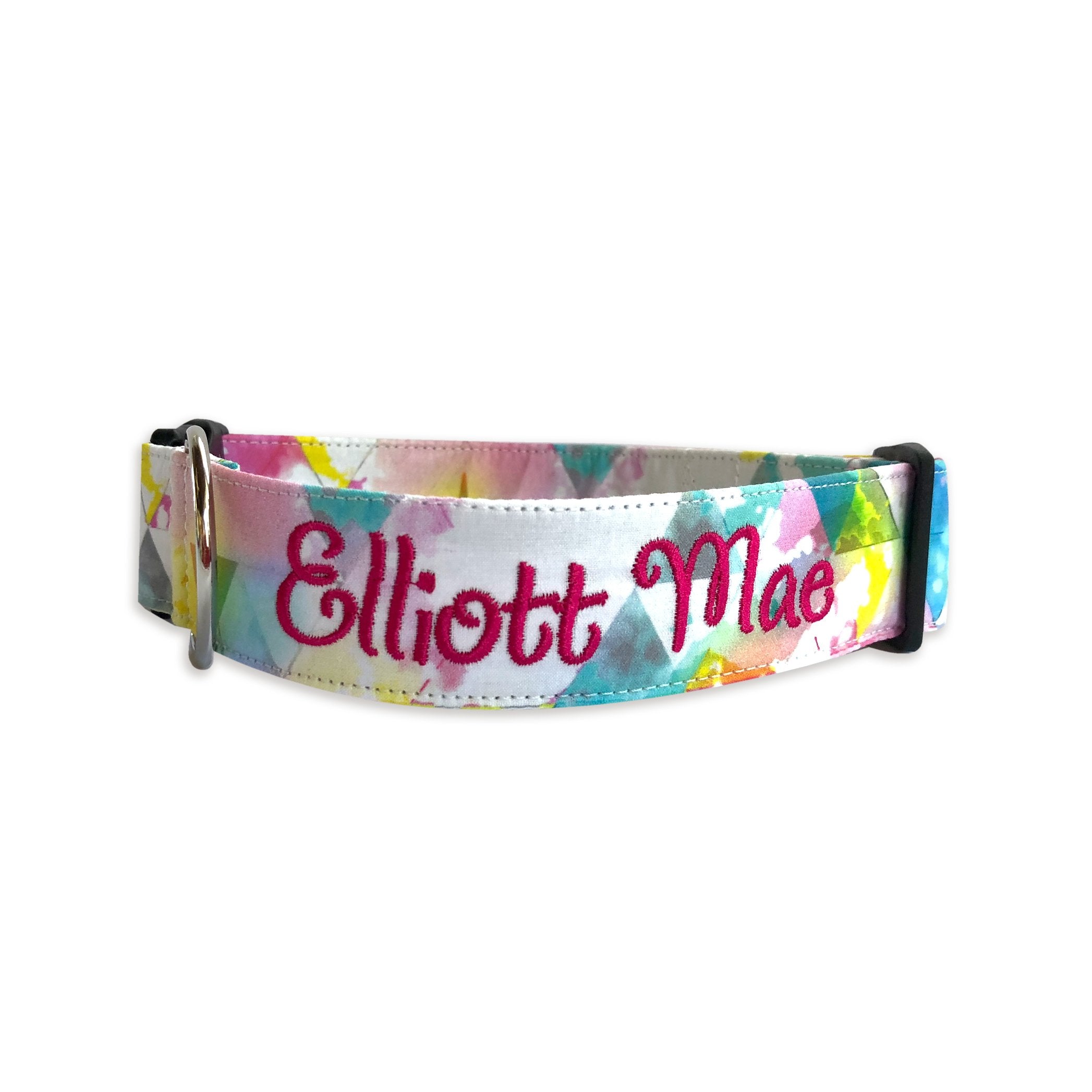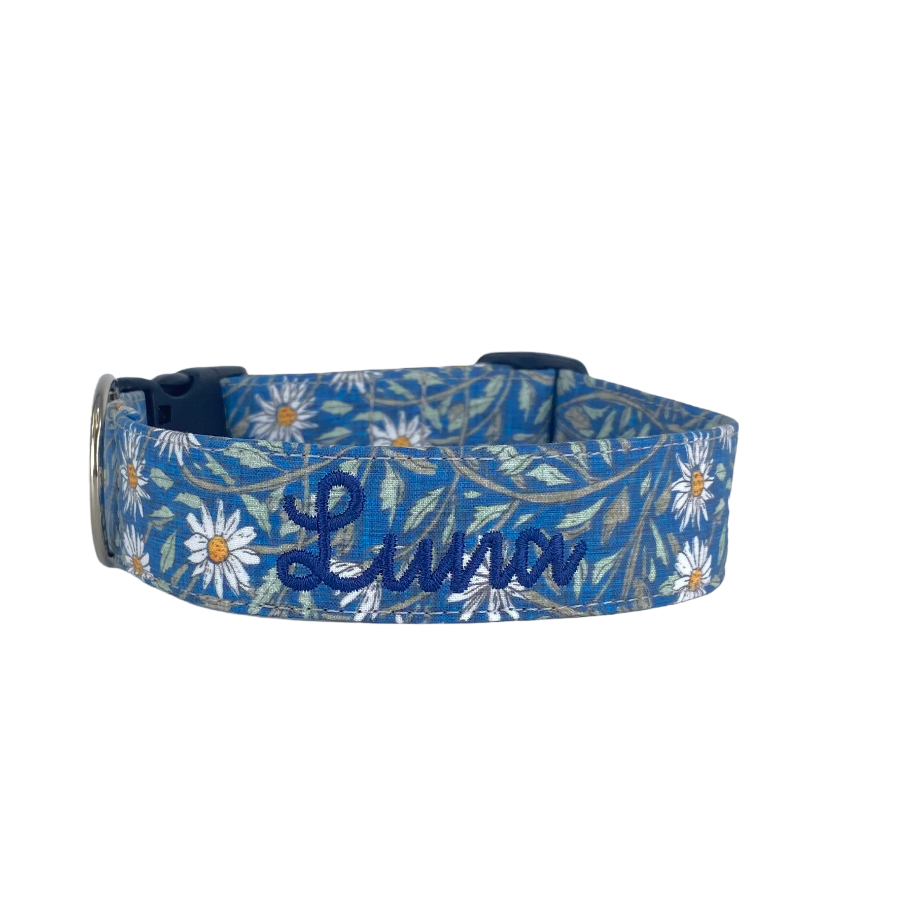 Our personalized embroidered dog collars are head turners! Our designer fabrics paired with your choice of font and thread color make for a great personalized and unique dog collar that shows their personality. Our embroidered dog collars also offer the option to be completed with an engraved buckle which offers more of that personal touch and also safety. Duke & Fox® custom dog collars are perfect for all dog breeds and come in a large variety of sizes. We also have matching collar accessories including leashes, bowties, flowers, and harnesses.