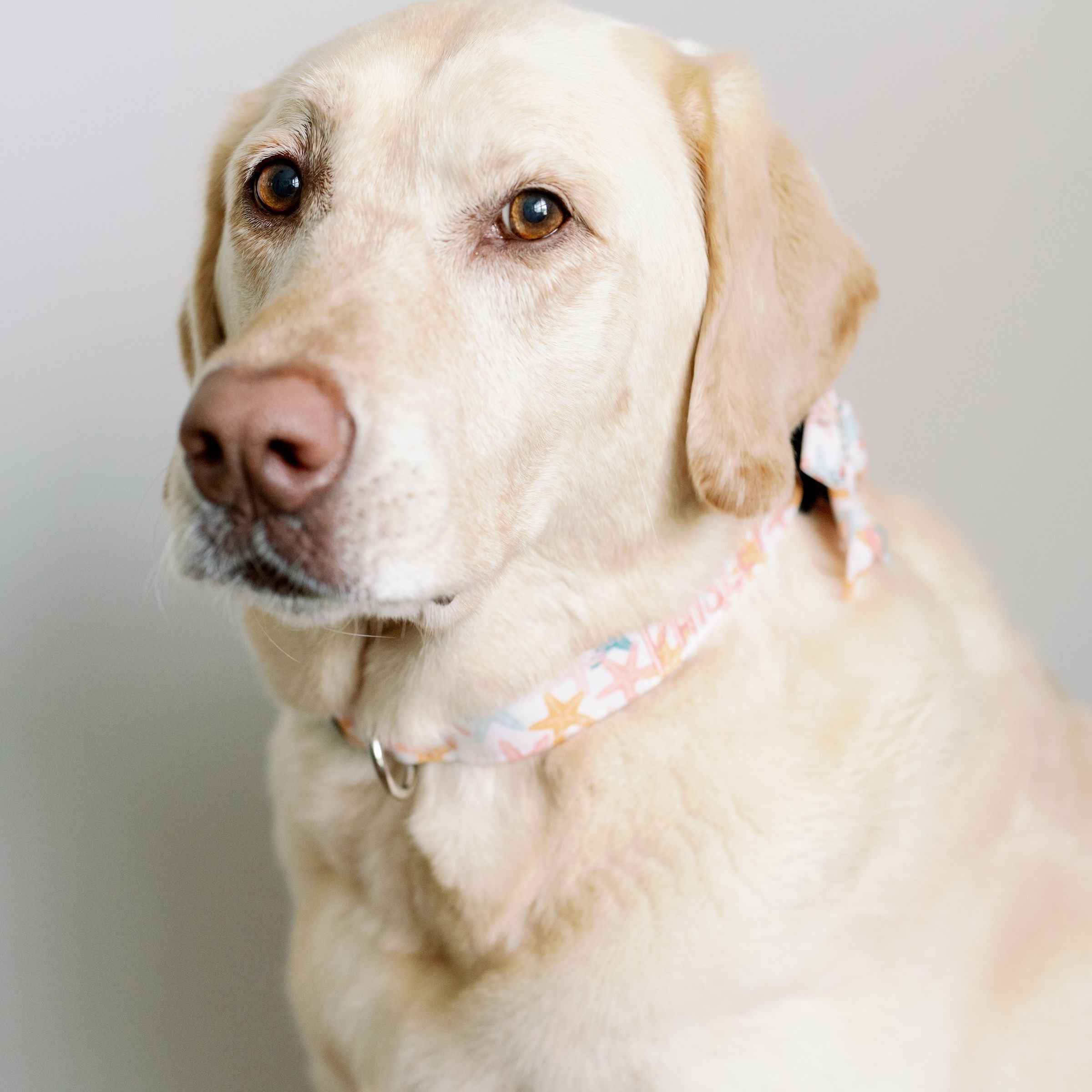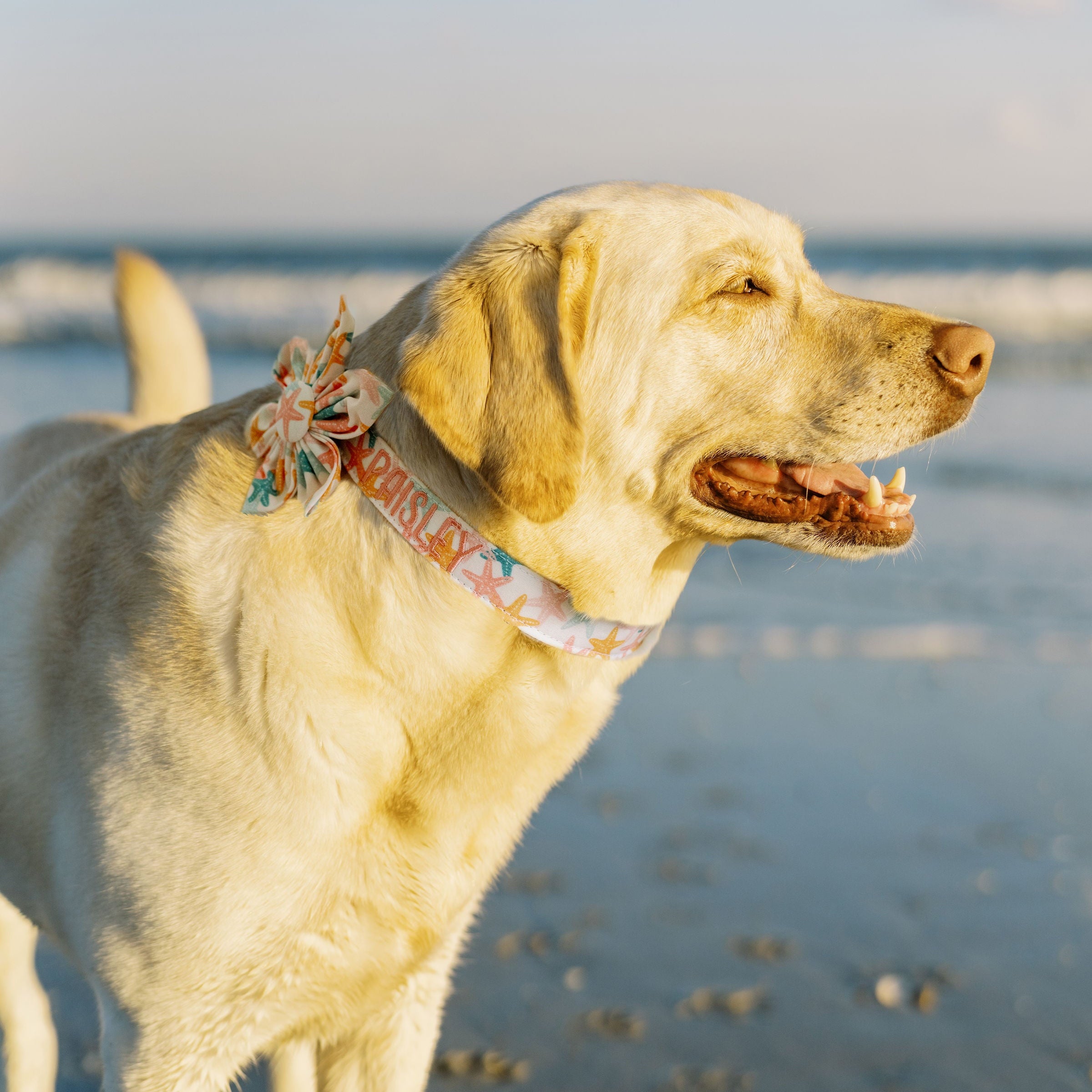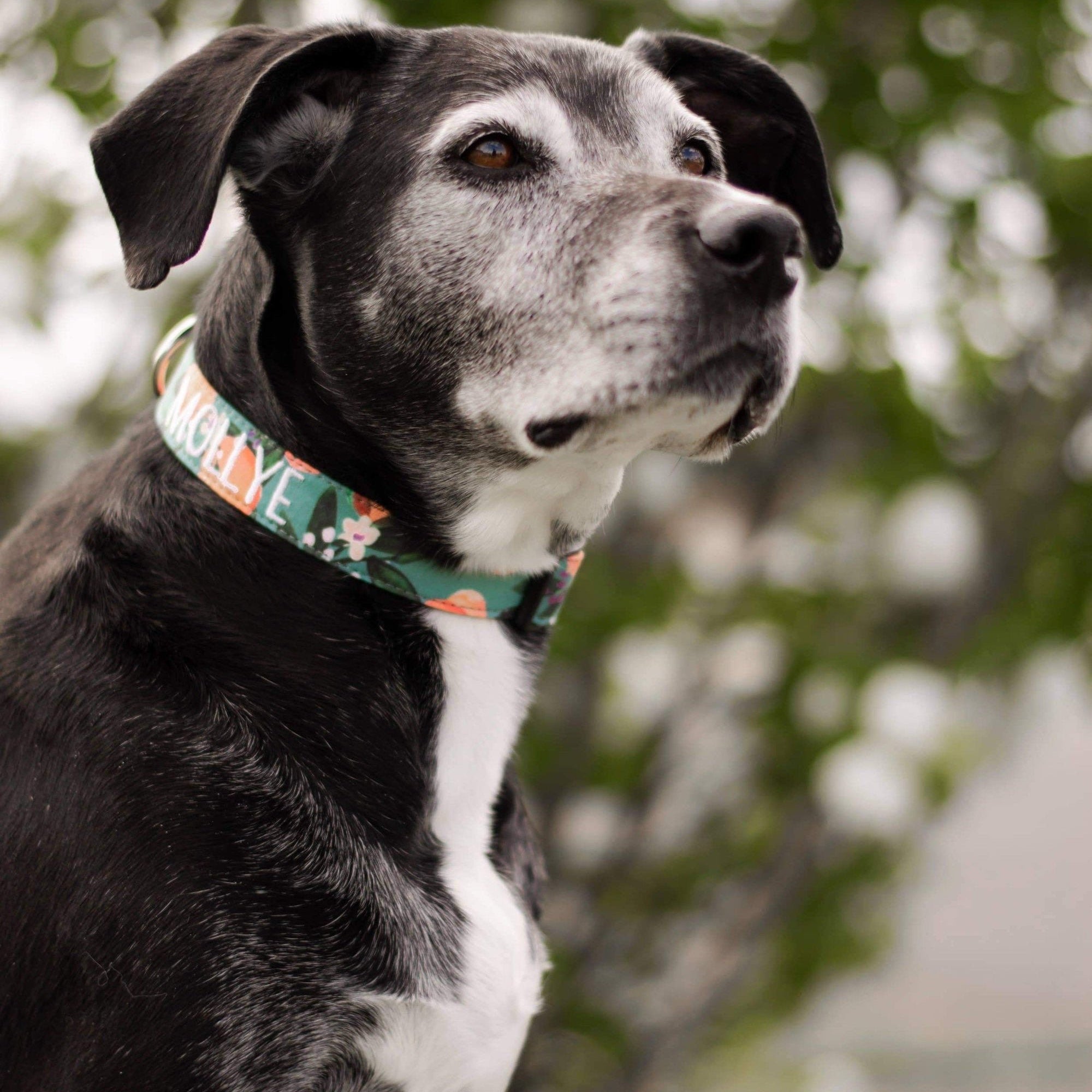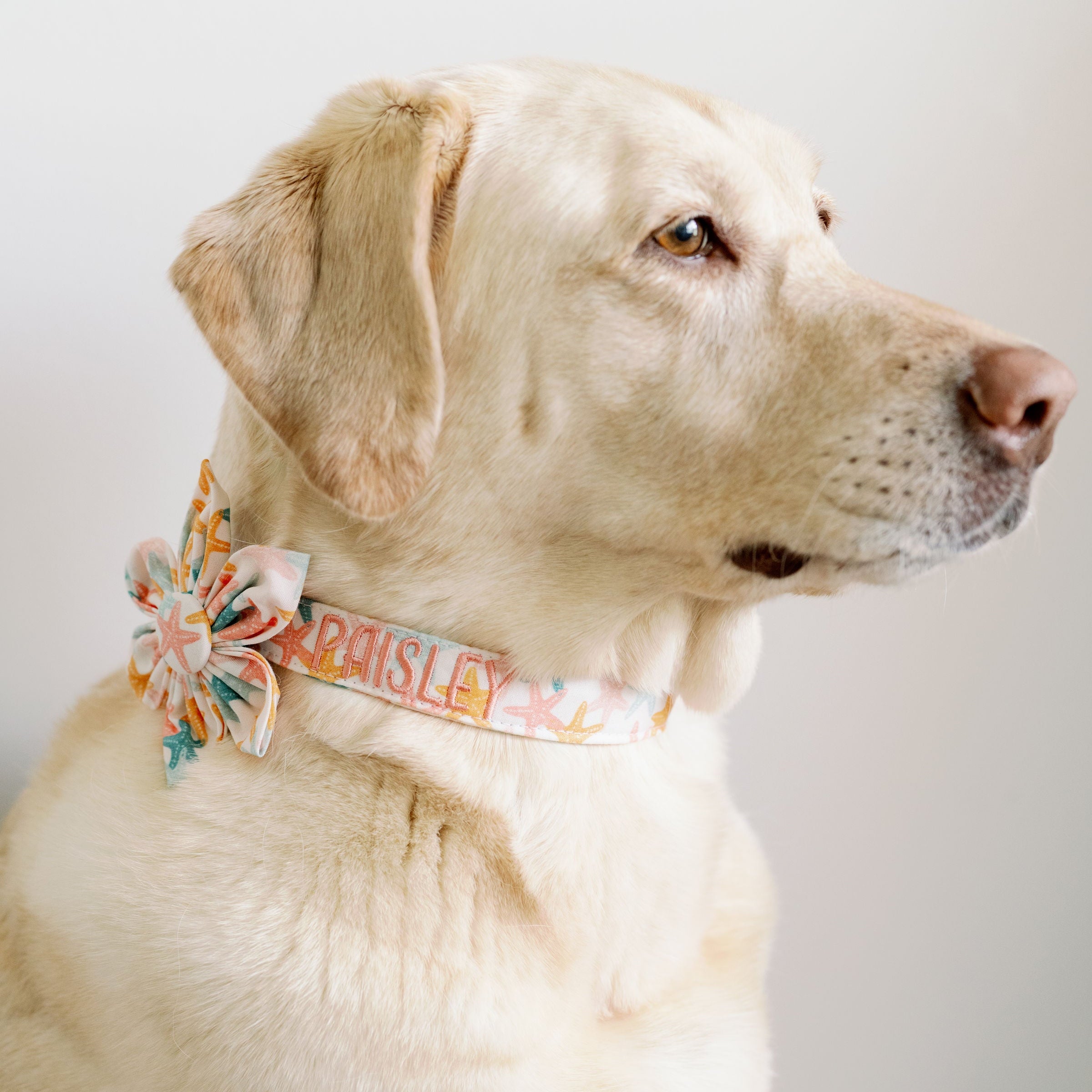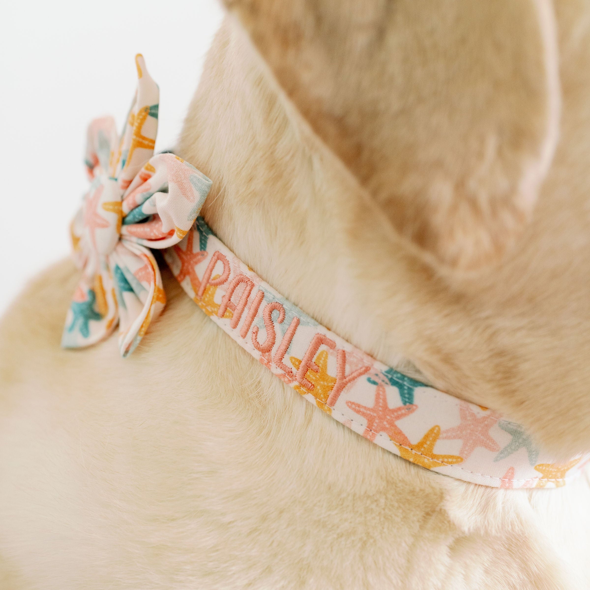 Our personalized embroidered dog collars are head turners! Our designer fabrics paired with your choice of font and thread color make for a great personalized and unique dog collar that shows their personality. Our embroidered dog collars also offer the option to be completed with an engraved buckle which offers more of that personal touch and also safety. Duke & Fox® custom dog collars are perfect for all dog breeds and come in a large variety of sizes. We also have matching collar accessories including leashes, bowties, flowers, and harnesses.