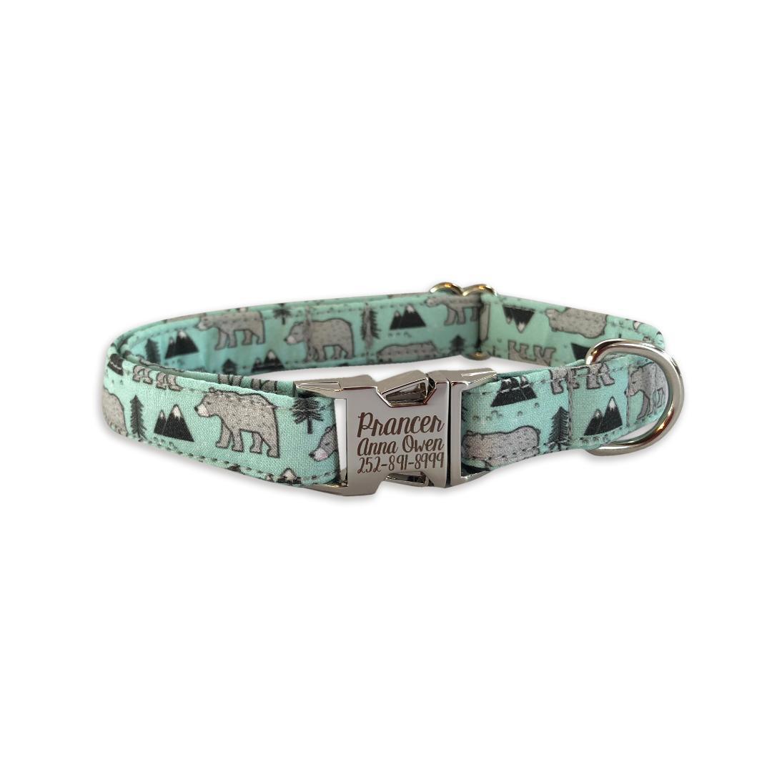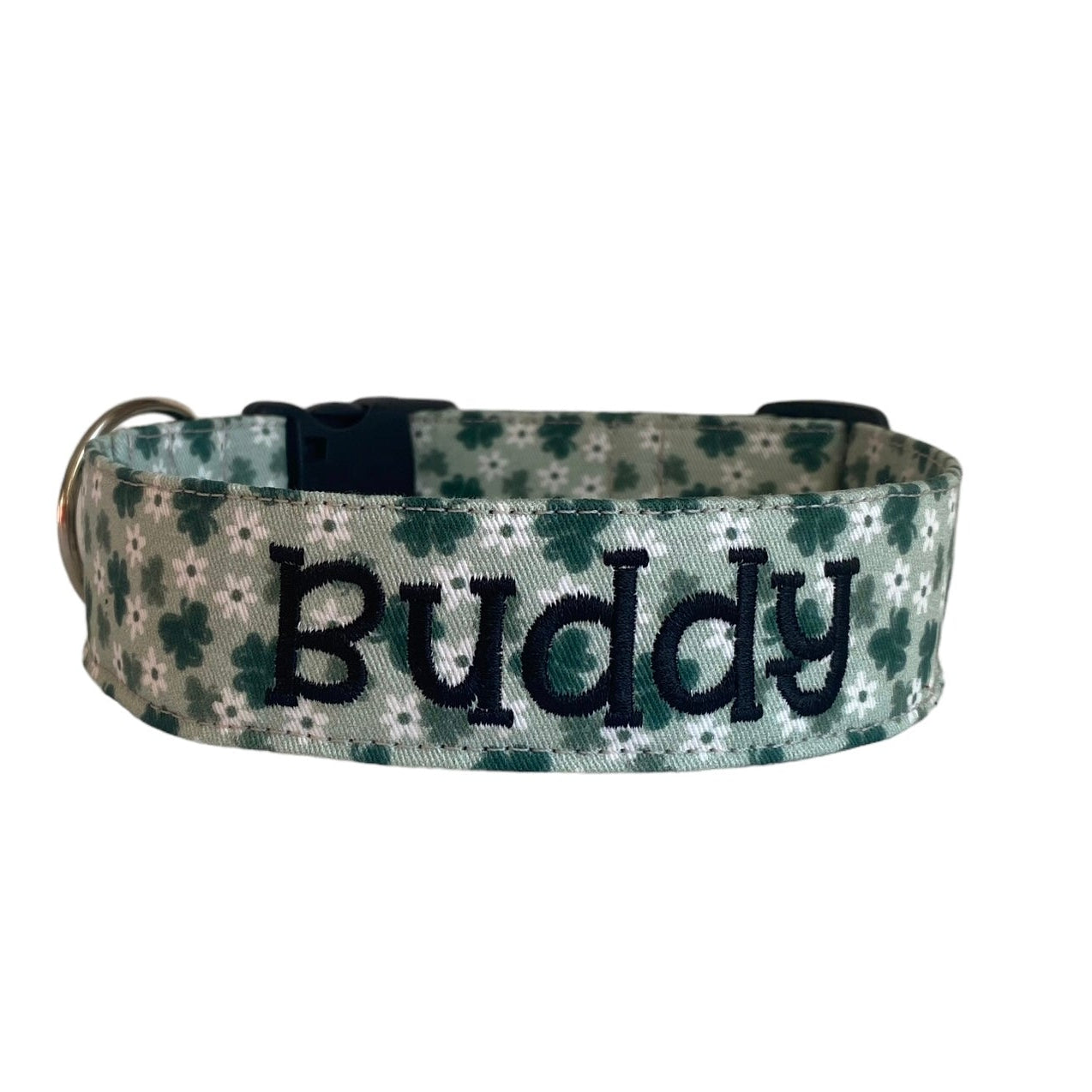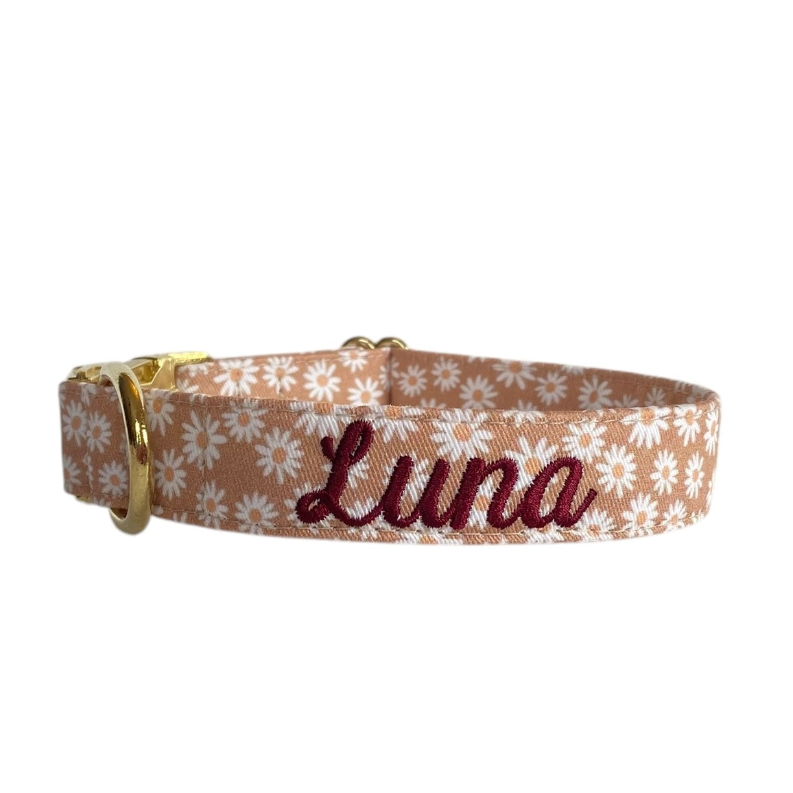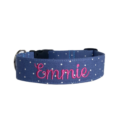 Our personalized embroidered dog collars are head turners! Our designer fabrics paired with your choice of font and thread color make for a great personalized and unique dog collar that shows their personality. Our embroidered dog collars also offer the option to be completed with an engraved buckle which offers more of that personal touch and also safety. Duke & Fox® custom dog collars are perfect for all dog breeds and come in a large variety of sizes. We also have matching collar accessories including leashes, bowties, flowers, and harnesses.