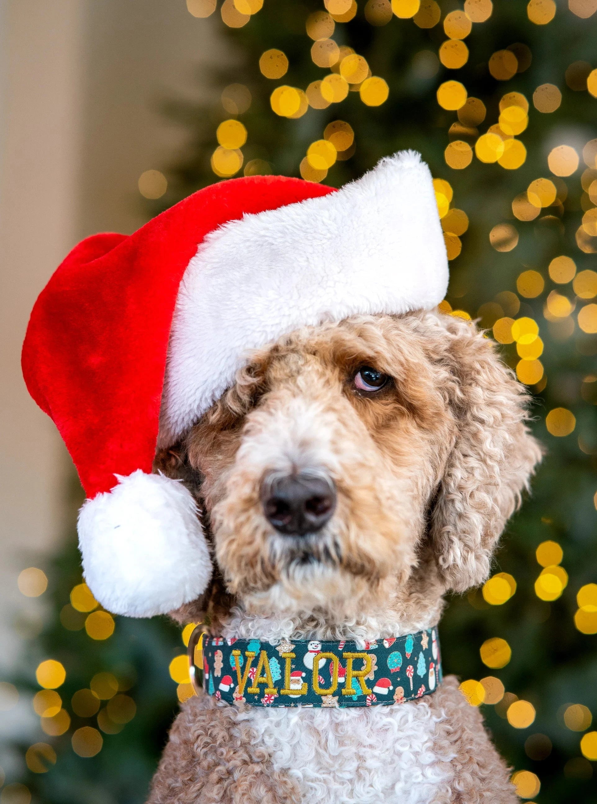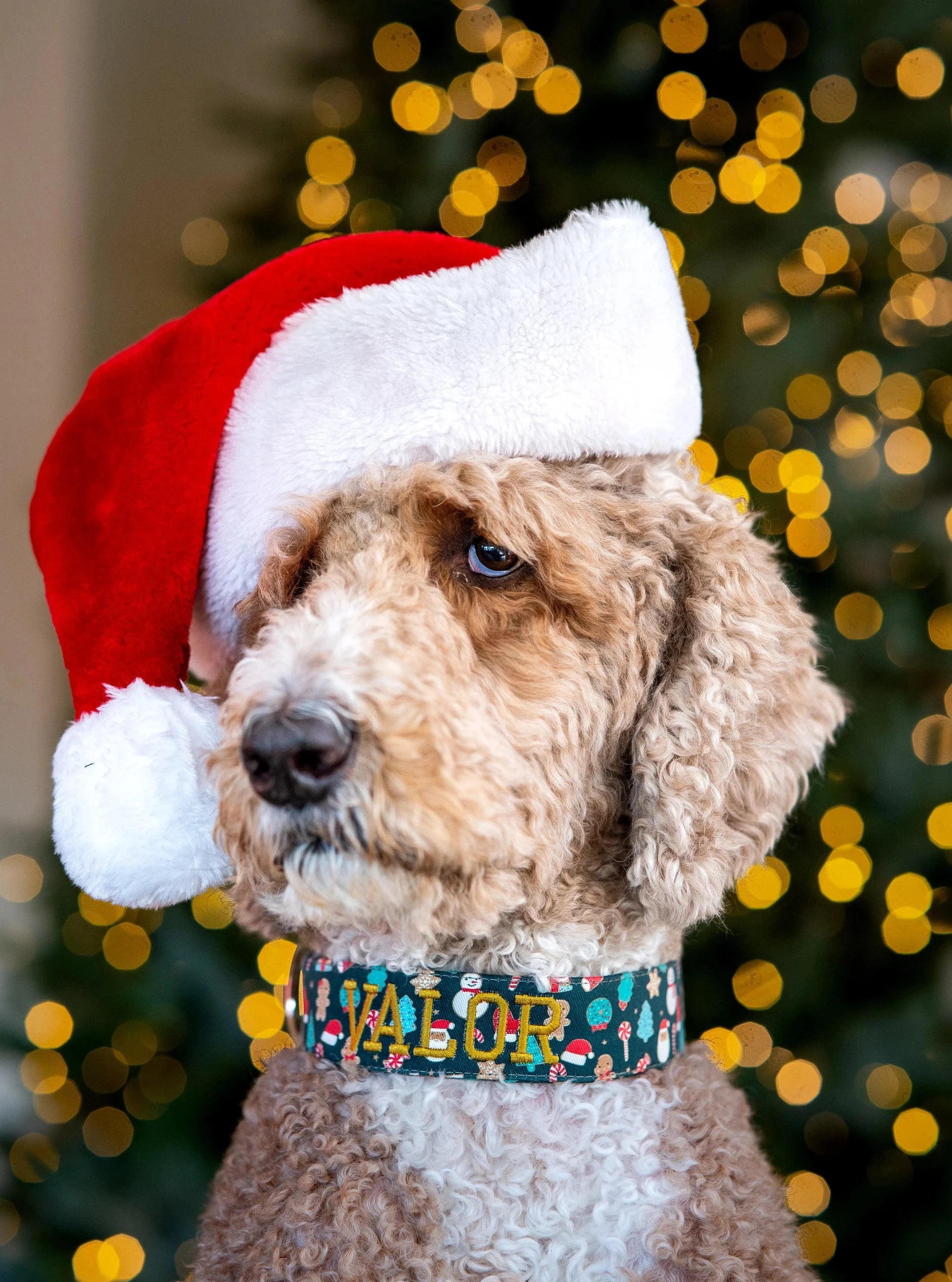 Our personalized embroidered dog collars are head turners! Our designer fabrics paired with your choice of font and thread color make for a great personalized and unique dog collar that shows their personality. Our embroidered dog collars also offer the option to be completed with an engraved buckle which offers more of that personal touch and also safety. Duke & Fox® custom dog collars are perfect for all dog breeds and come in a large variety of sizes. We also have matching collar accessories including leashes, bowties, flowers, and harnesses.