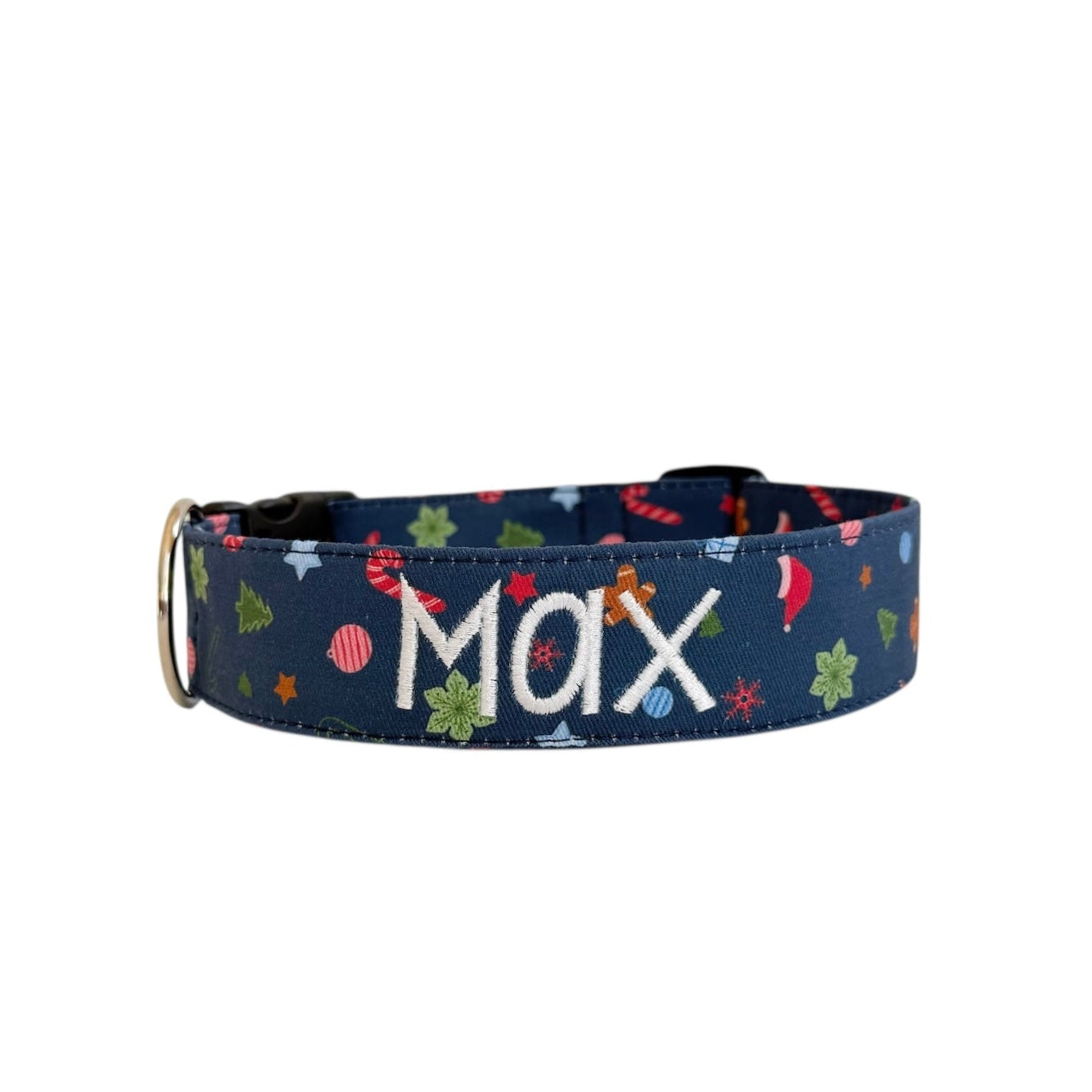 Our personalized embroidered dog collars are head turners! Our designer fabrics paired with your choice of font and thread color make for a great personalized and unique dog collar that shows their personality. Our embroidered dog collars also offer the option to be completed with an engraved buckle which offers more of that personal touch and also safety. Duke & Fox® custom dog collars are perfect for all dog breeds and come in a large variety of sizes. We also have matching collar accessories including leashes, bowties, flowers, and harnesses.