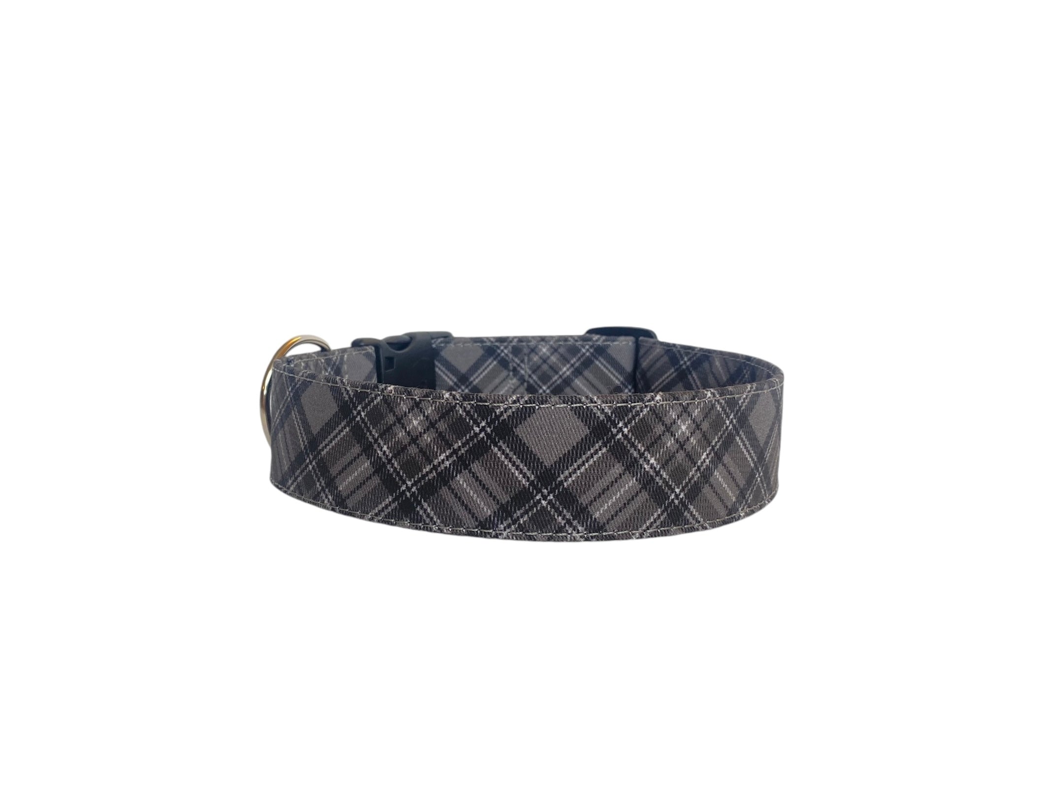 A classic and stylish pet accessory featuring a timeless plaid pattern in shades of gray.