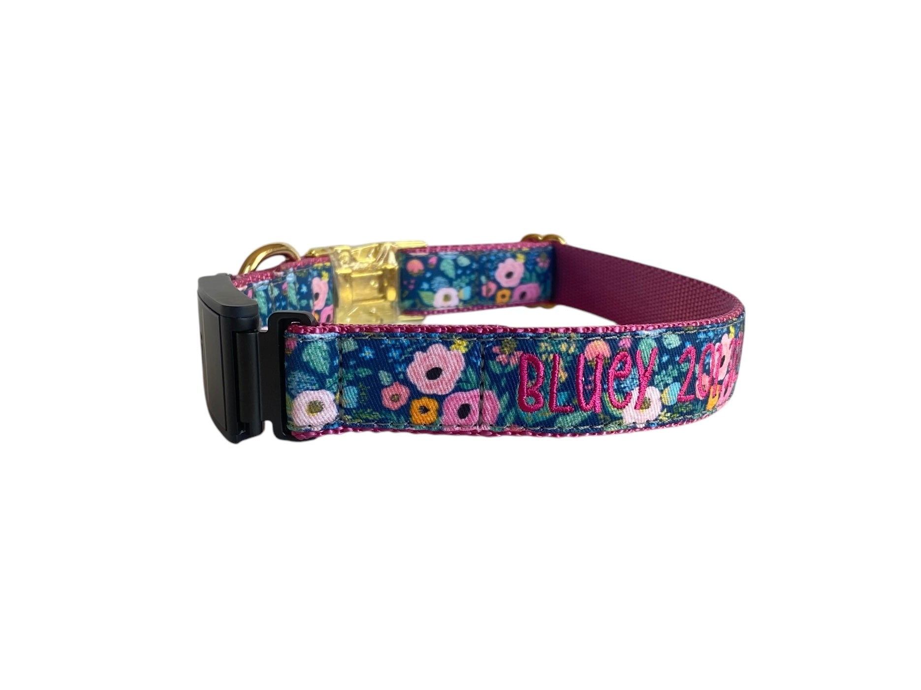 This is only offered in 1” width. Depending on the size of your dogs neck the embroidery can be adjusted over but, contact information is still visible for identification purposes. We do not accept refunds and/or exchanges for our custom made items.