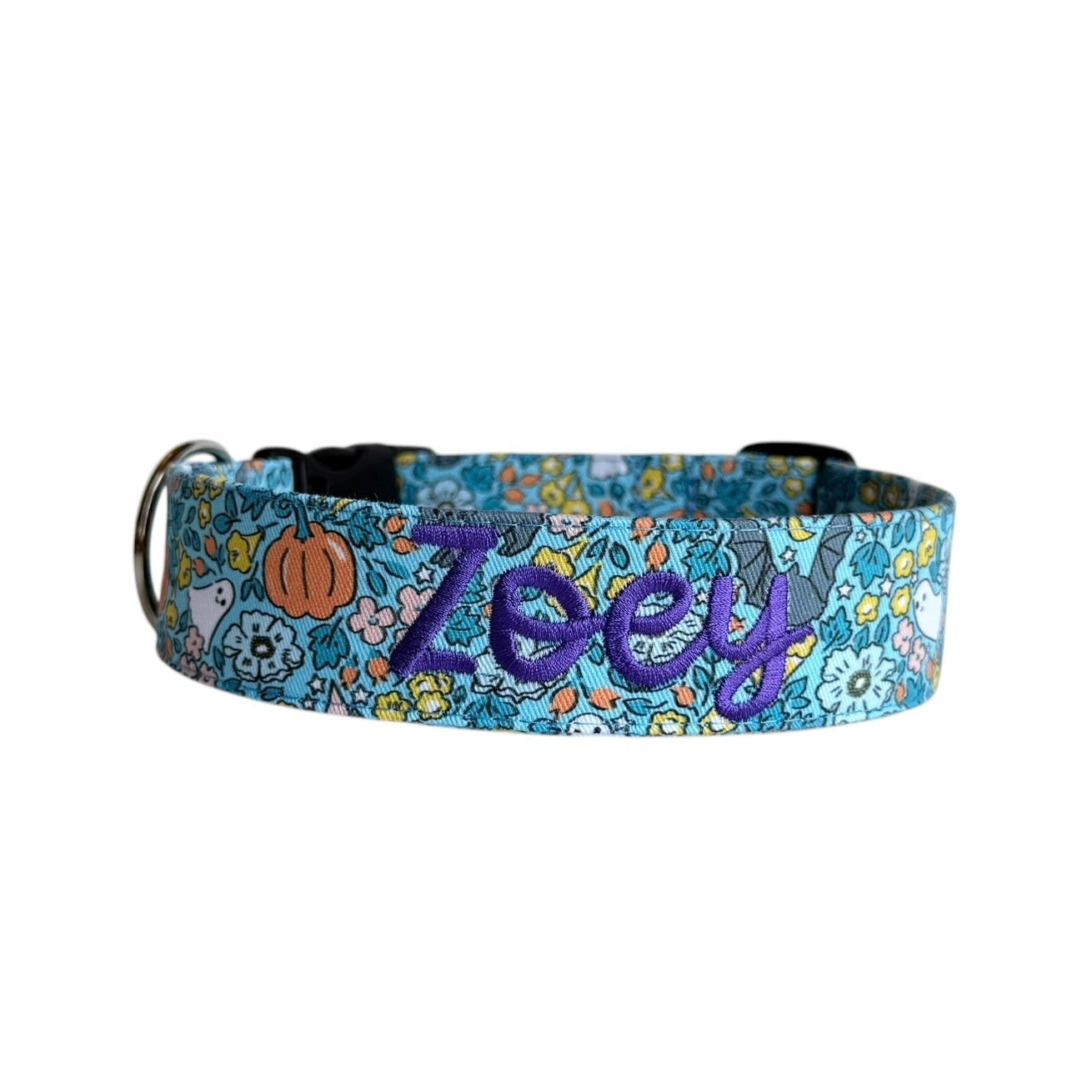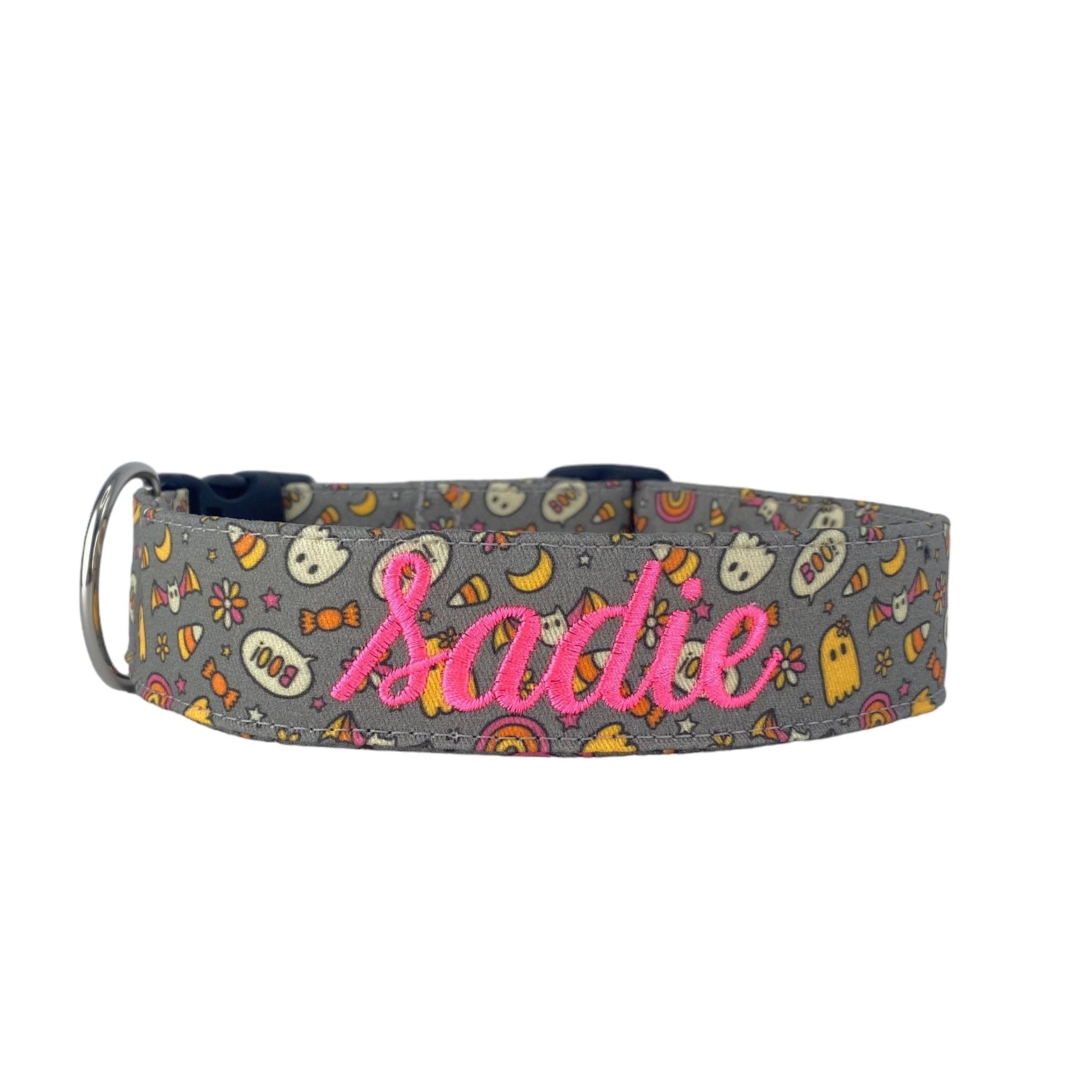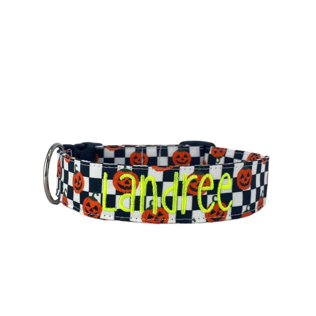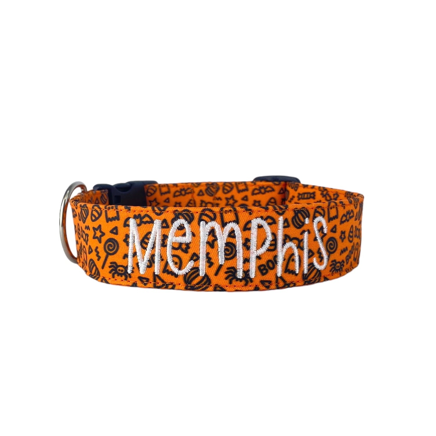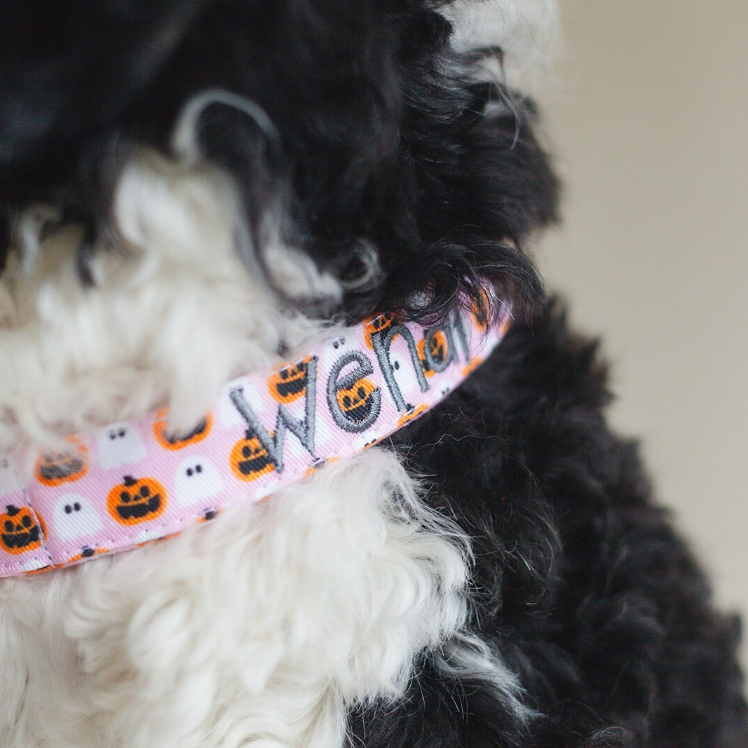 Handmade in Tennessee, our festive collars feature fun Halloween patterns—perfect for trick-or-treating, costume parties, and cozy fall strolls. Personalize your collar with your dog’s name and your contact info using high-quality embroidery. Choose from a variety of spooky designs, thread colors, and font styles to create a one-of-a-kind look that keeps your pup both safe and stylish. Complete the Halloween vibe with our matching leashes, bow ties, and flowers!