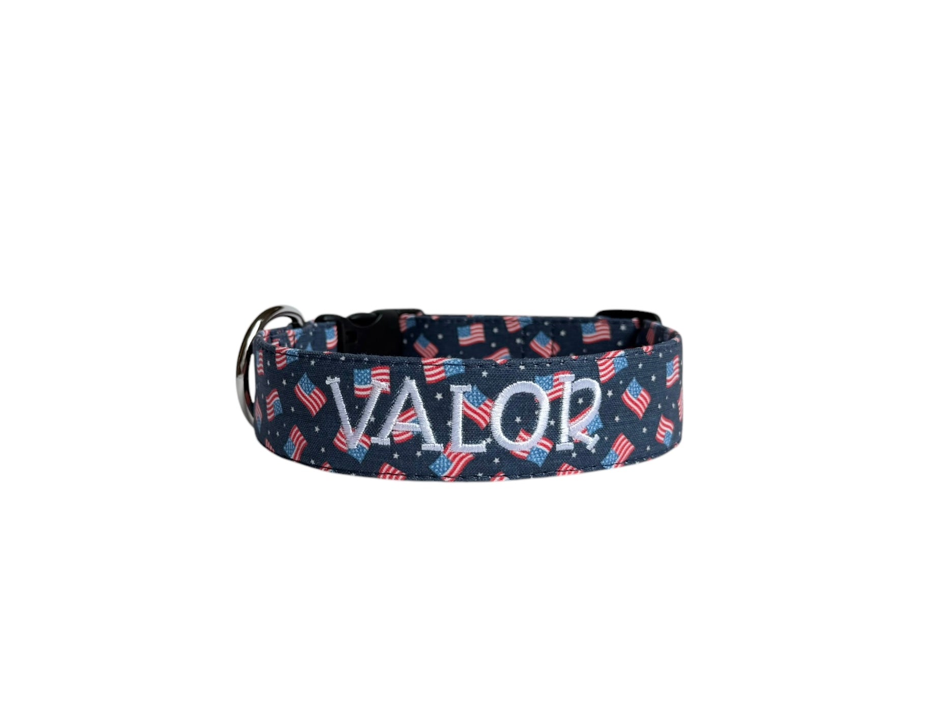Our collars are functional, stylish, and handmade to stand out and express your pup's personality and your sense of style. Duke & Fox® custom dog collars are made to order and are customized to your exact criteria. You have the option of choosing the pattern, thread colors, font, and buckle style. We also offer matching leashes, bow ties, flowers, and bandanas to complete your look.