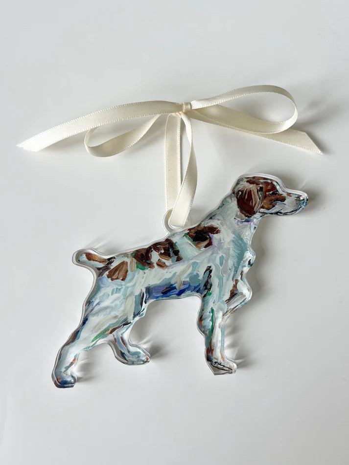 Acrylic ornament printed with Chelsea McShane's original Brittany Spaniel art design.