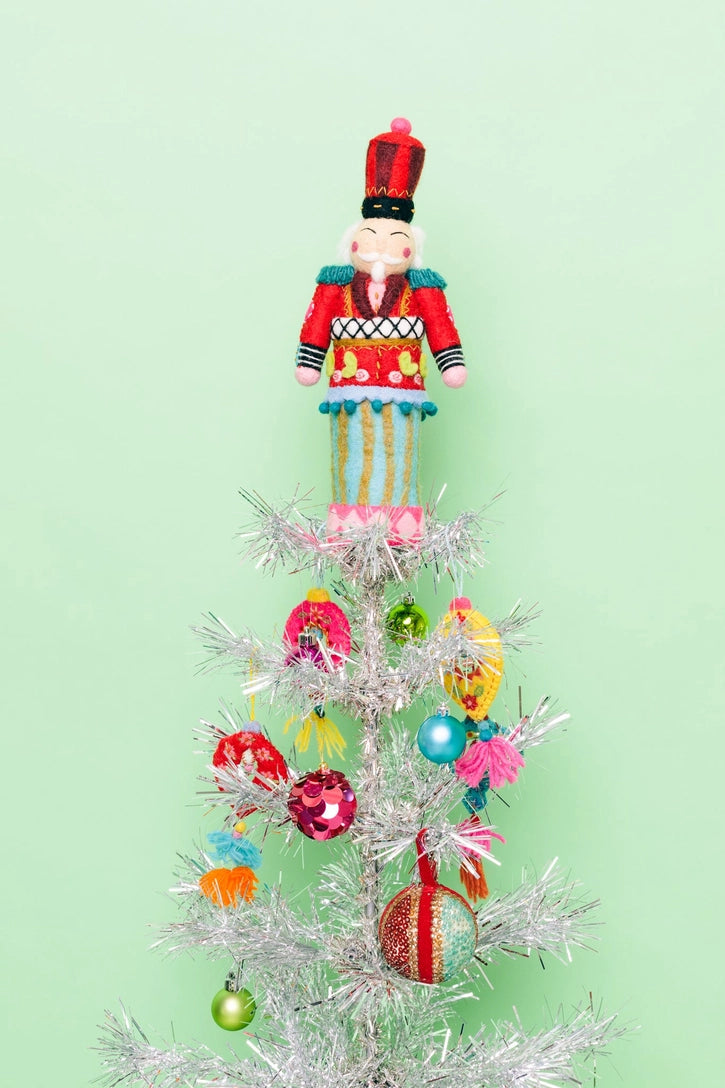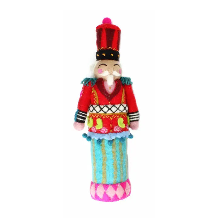 Add this uniquely designed nutcracker to the top of your tree this holiday season. They are hand felted and embroidered by artisans in Nepal. 14" tall. 100% felted wool.