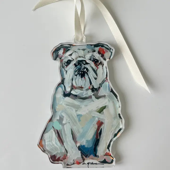 Acrylic ornament printed with Chelsea McShane's original English Bulldog artwork.