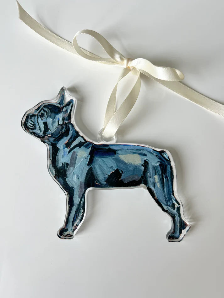Acrylic ornament printed with Chelsea McShane's original Frenchie Blue art design.