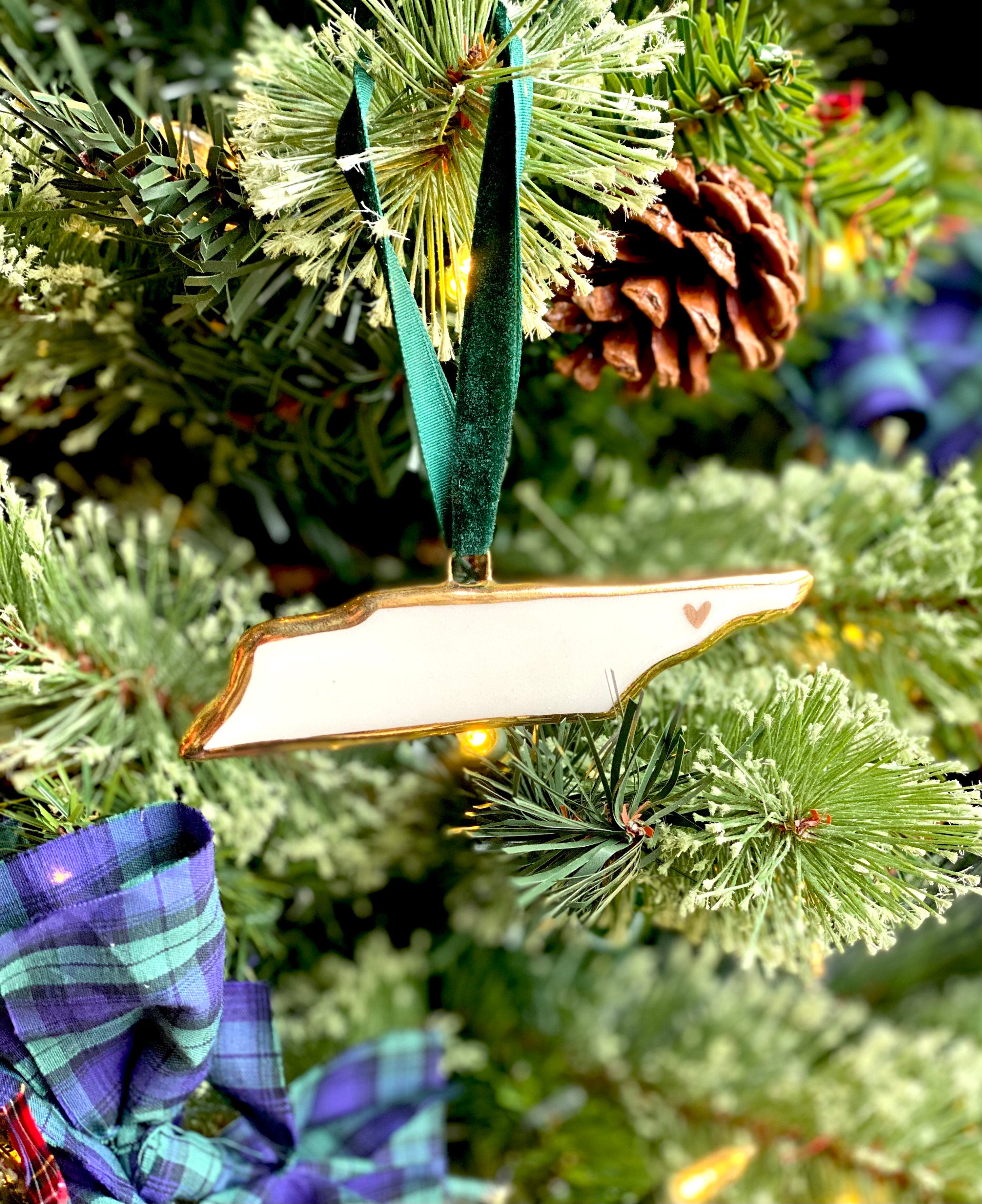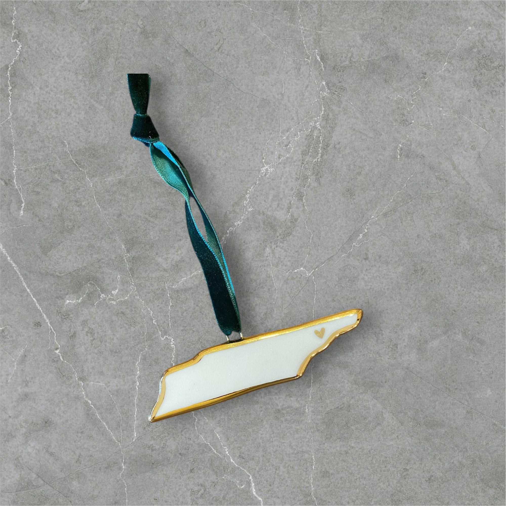Celebrate your TN pride with these beautiful porcelain ornaments, each handmade in the shape of Tennessee. Outlined in luxurious 22k gold luster, these ornaments capture the elegance and charm of the season, making them perfect for holiday decorating or year-round display. Each ornament features a delicately placed gold heart on our beloved town of Jonesborough,TN.