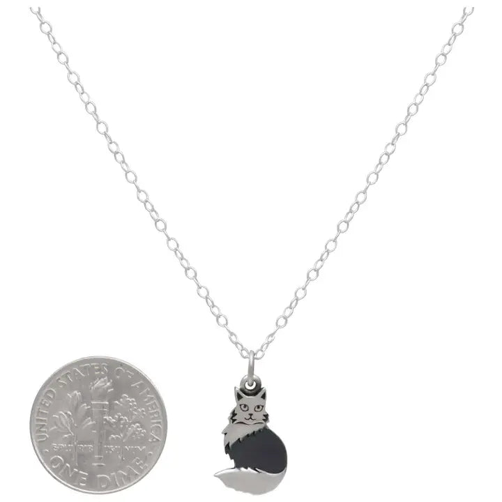 This sterling silver fluffy cat necklace is full of life. From her pointy ears and lively whiskers to her fluffy mane and tail, this little kitty is sitting pretty. She's sassy and full of attitude, and can't wait for you to give her a proper home. Can't you just see her sitting by your window, wondering why ever are you gone so long? The layered design and oxidized body lend this cat charm noteworthy dimension and contrast.
