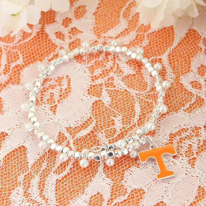 Tennessee Enamel Logo & Pearl Bracelet. This imitation pearl wire wrap bracelet features an enamel Tennessee logo charm.This is an officially licensed item. This is an officially licensed product.
