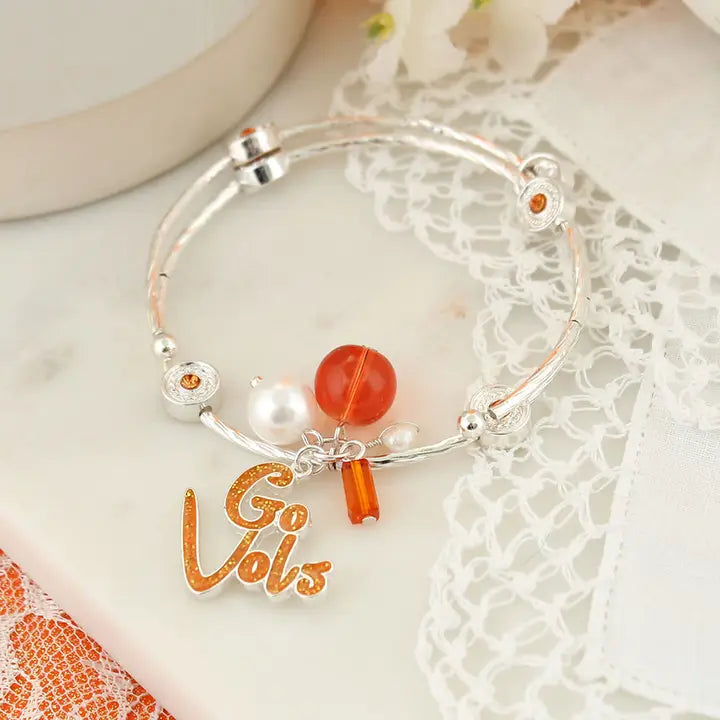 Silver plated wrap bracelet featuring orange rhinestones, beads and enamel with imitation pearl bead accents and the “Go Vols” slogan. This is an officially licensed product.