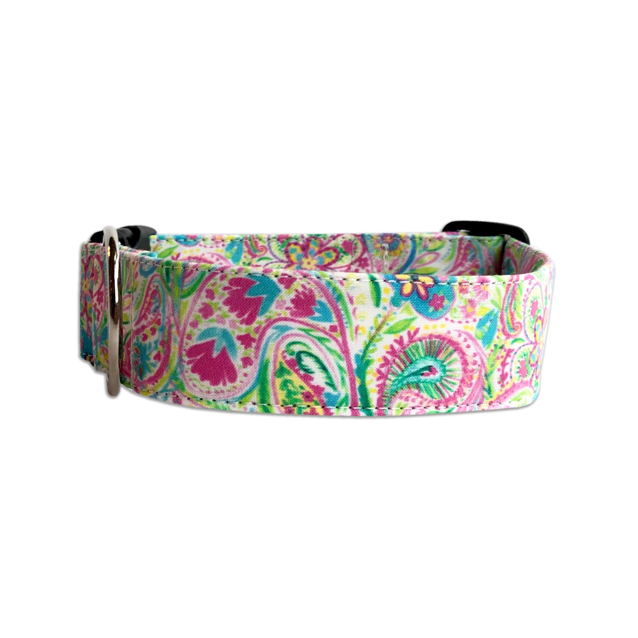 Martingales will be made in matching material and are slip on dog collars that are best suited for dogs that slip out of collars easily. When the dog pulls, the martingale tightens so the dog cannot escape. Martingale collars are intended to be used while on walks and not left on unsupervised.