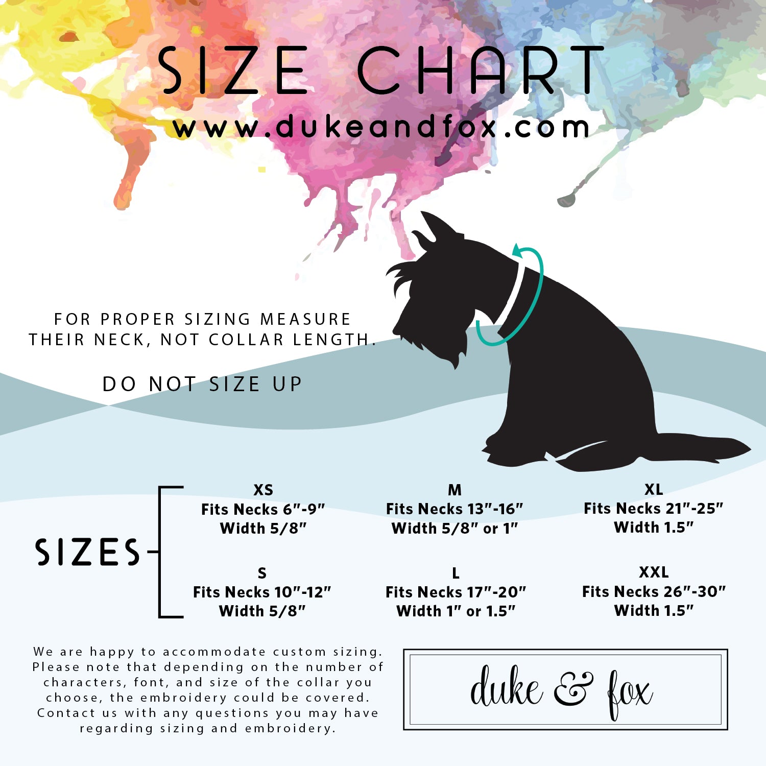 Please keep in mind our size chart provides sizing based upon the dogs neck in inches, not the length of the collar. Do not size up, our size chart is optimized to prevent embroidery from being covered. We offer a large variety of sizes but, if you feel uncertain of which size to choose, please purchase the closest size and leave a note in the special instructions box, we are happy to custom size your collar so it is a perfect fit.