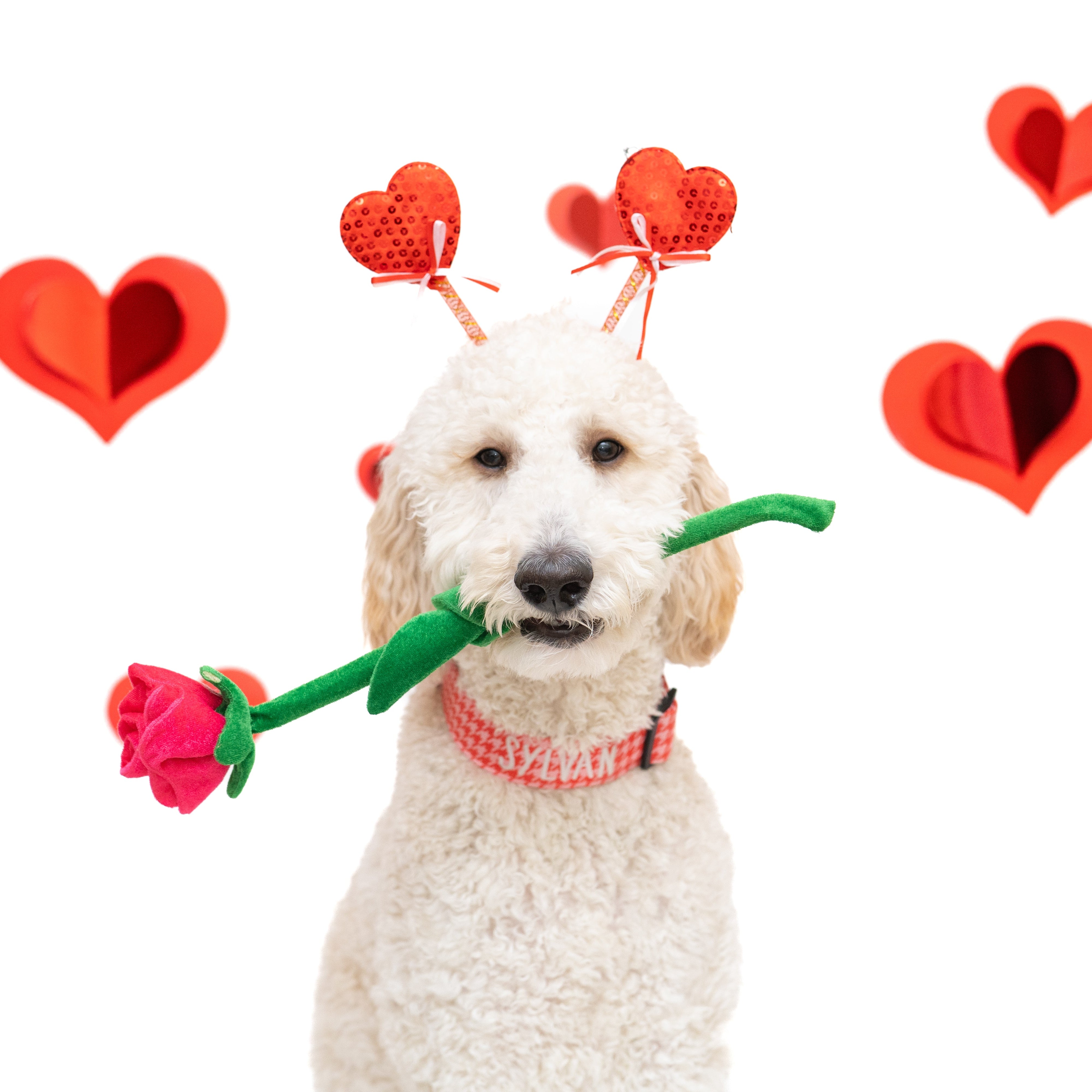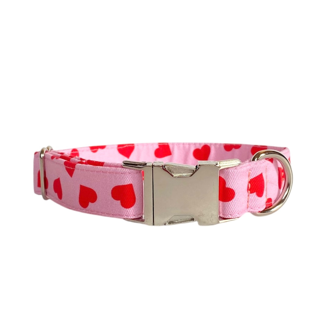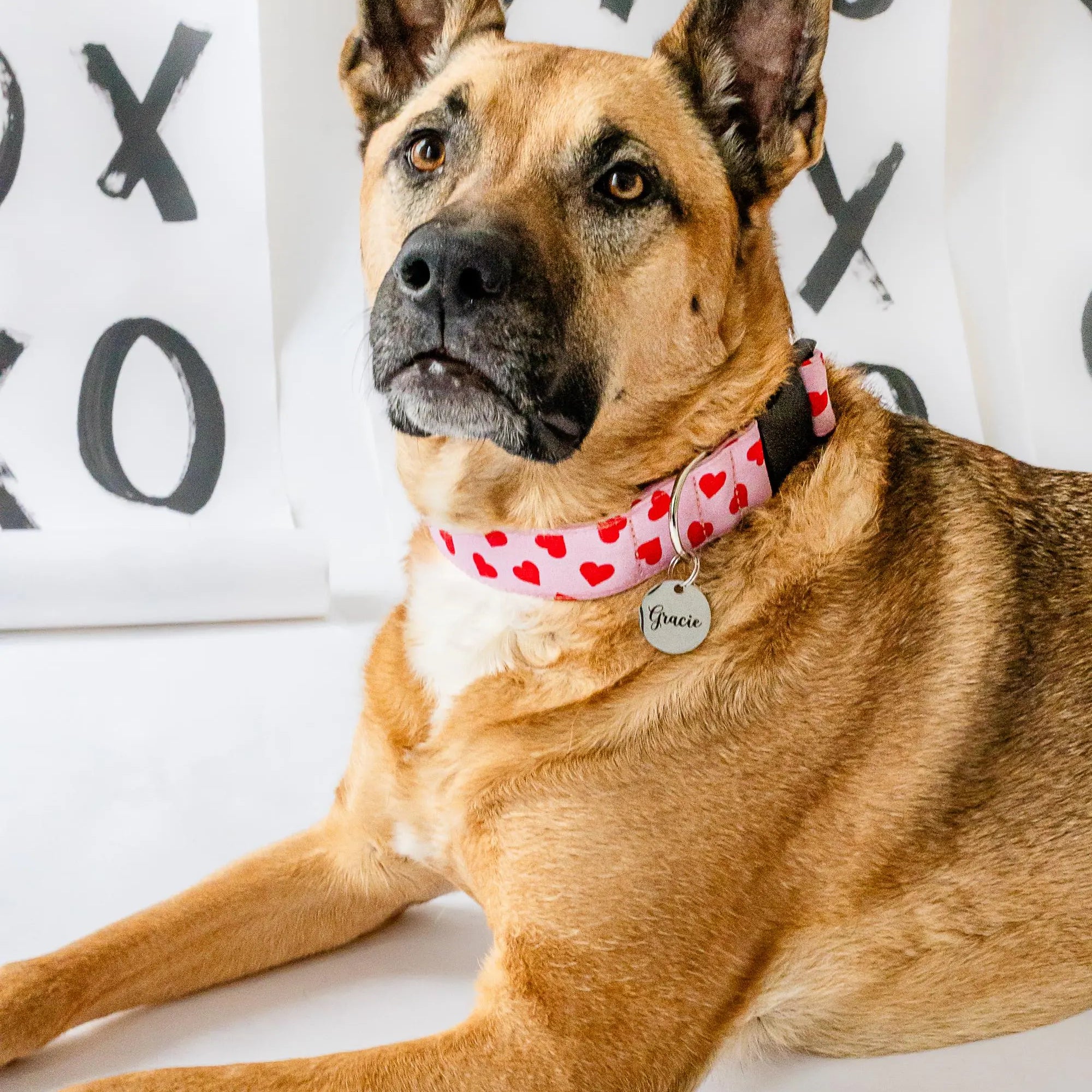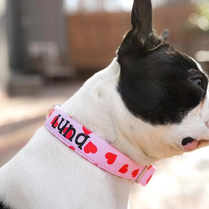 Fall in love with Duke & Fox® personalized dog collars—made just for Valentine’s Day! These collars are handcrafted in the USA and feature sweet, heart-filled designs in shades of pink, red, and white. Personalize yours with your pup’s name and your contact information, beautifully embroidered in your choice of thread color and font. Whether you're celebrating with a puppy love photoshoot or just spreading joy on daily walks, these collars are the perfect way to show off your dog’s festive spirit. Complete the look with matching leashes, bow ties, and collar flowers for the ultimate Valentine’s style.
