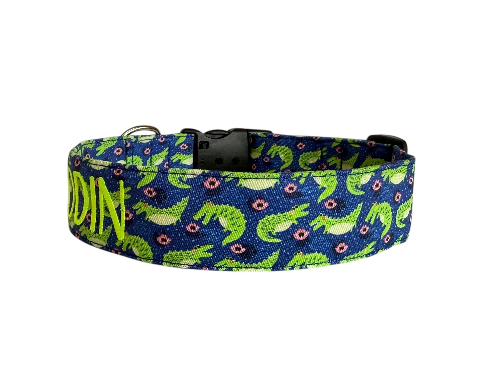 Make a splash with this personalized alligator dog collar! This handmade collar is perfect for everyday wear, swamp strolls, and any adventures.