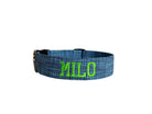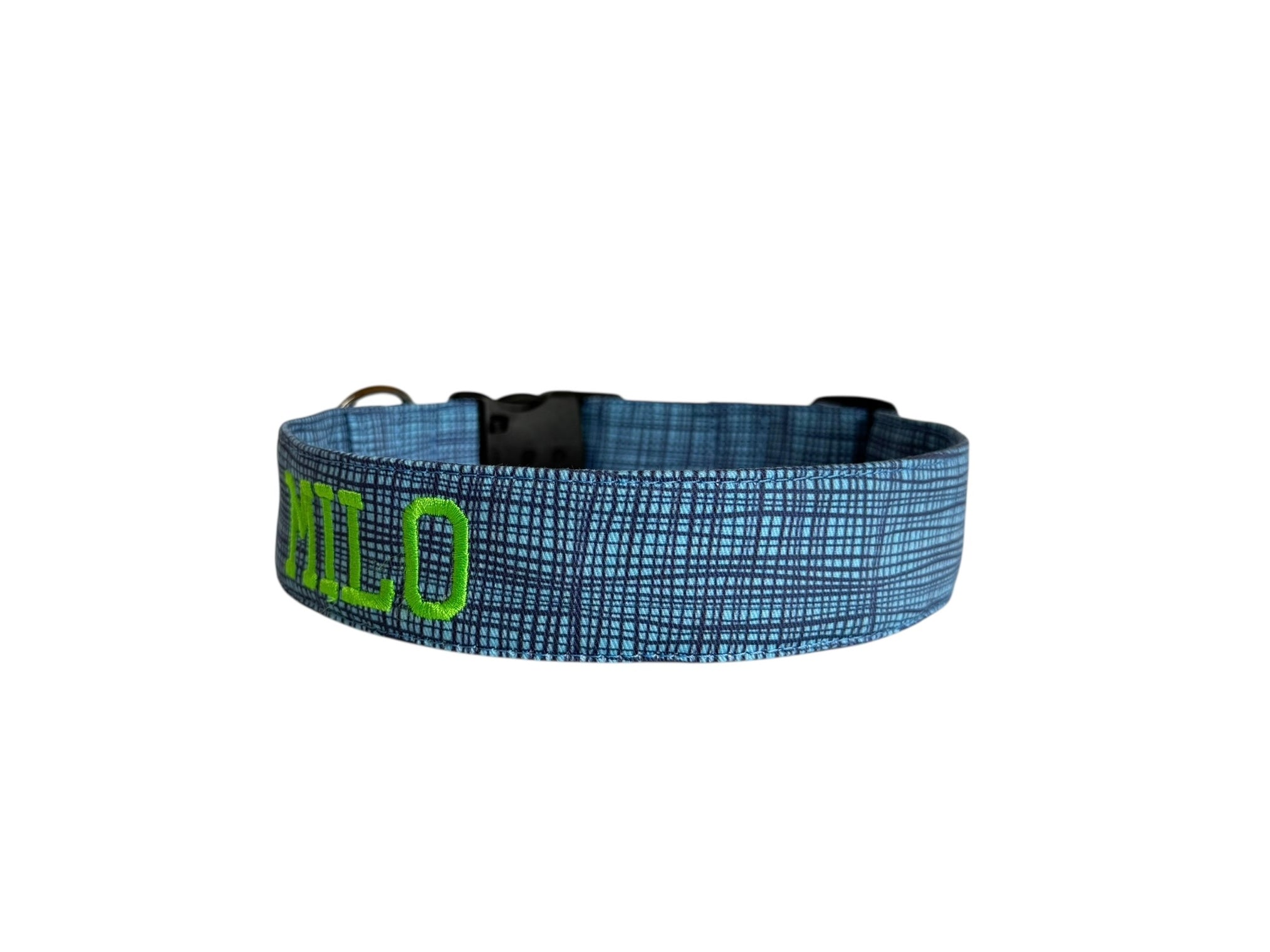 Understated yet bold, this custom embroidered dog collar features a rich blue woven pattern that adds subtle texture and depth. The clean lines and vibrant name personalization create a sharp, modern look. Built for durability and all-day comfort, it’s a refined everyday collar with just the right pop of color.
