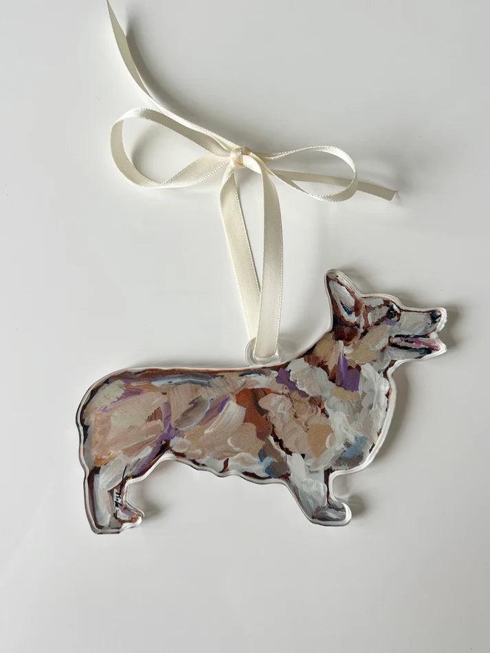 Acrylic ornament featuring Chelsea McShane’s original Corgi artwork.
