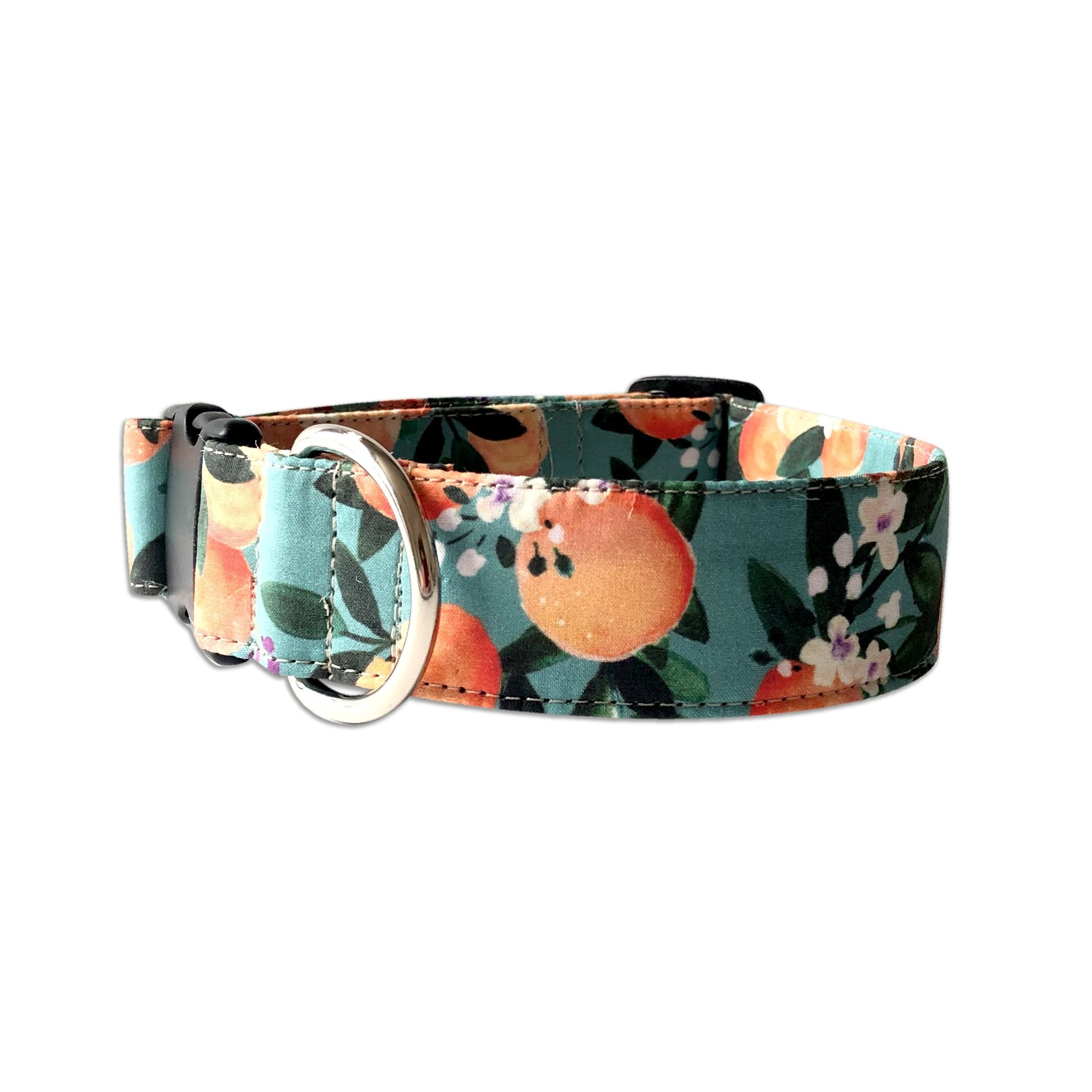 Martingales will be made in matching material and are slip on dog collars that are best suited for dogs that slip out of collars easily. When the dog pulls, the martingale tightens so the dog cannot escape. Martingale collars are intended to be used while on walks and not left on unsupervised.