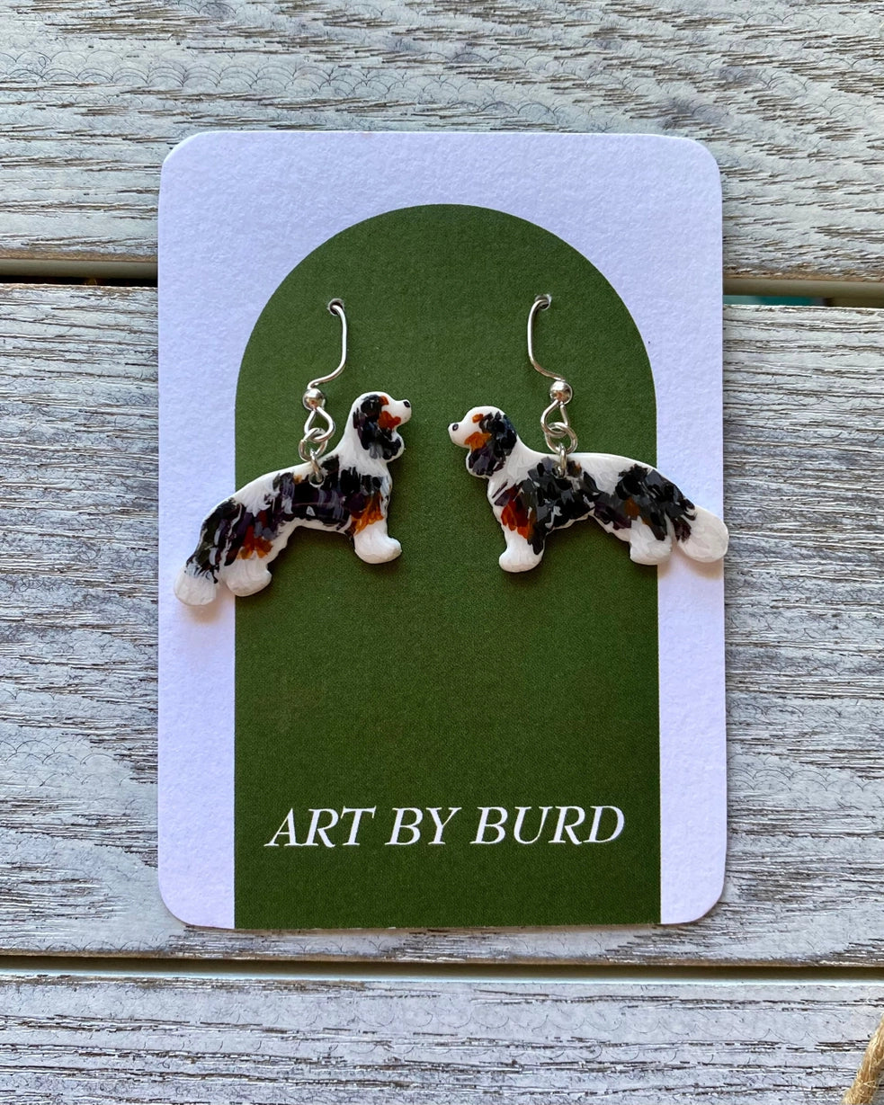 Celebrate your favorite pup with these handcrafted Cavalier King Charles earrings, made to order in Maryland by Art by Burd. Each pair is sculpted from high-quality polymer clay, hand-painted with acrylics, and sealed with a durable UV resin for a glossy finish. The earrings are lightweight, approximately 1 inch in height, and finished with nickel-free hardware, making them perfect for sensitive ears. A unique, artisan-made gift for dog lovers and a fun way to show off your favorite breed!