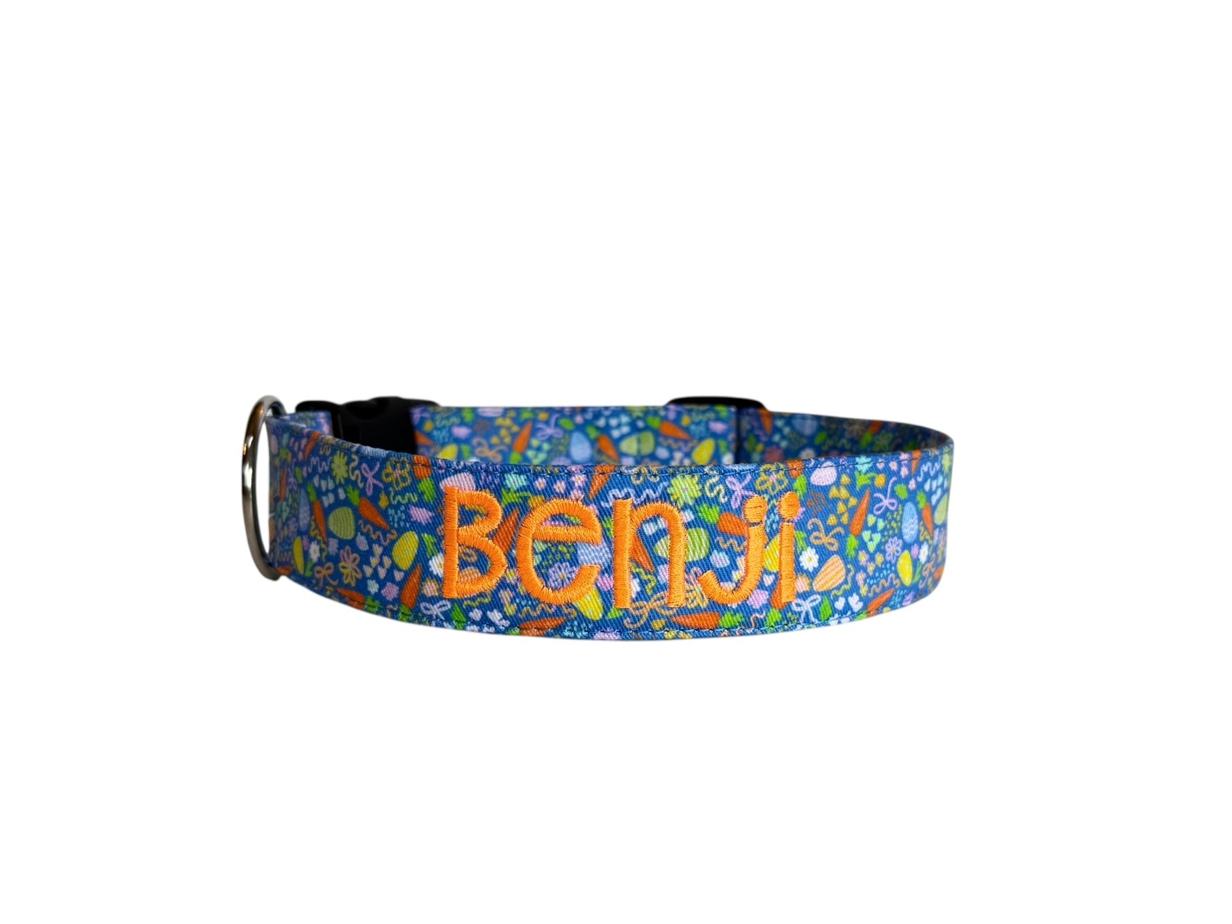Celebrate spring with this personalized Easter dog collar featuring a colorful pattern of carrots, eggs, and florals. This collar is durable, comfortable, and perfect for Easter photos, egg hunts, and festive everyday wear.