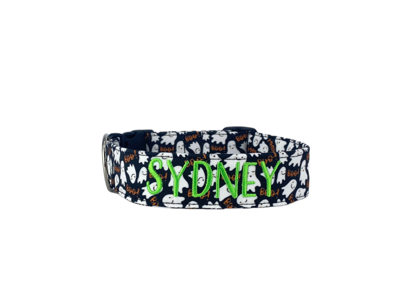 Please keep in mind our size chart provides sizing based upon the dogs neck in inches, not the length of the collar. Do not size up, our size chart is optimized to prevent embroidery from being covered. We offer a large variety of sizes but, if you feel uncertain of which size to choose, please purchase the closest size and leave a note in the special instructions box, we are happy to custom size your collar so it is a perfect fit.