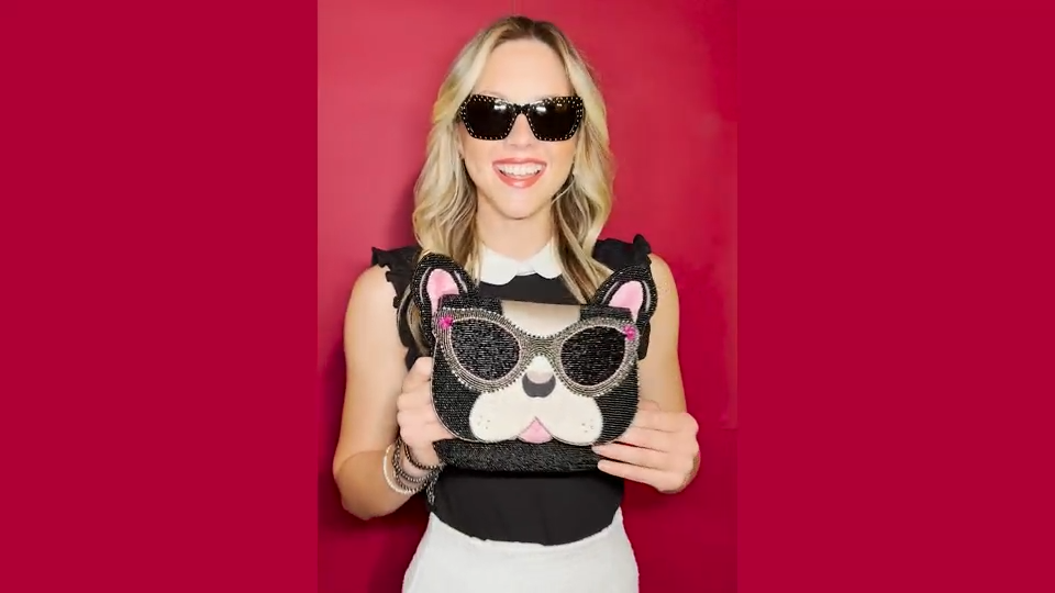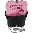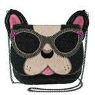 This adorable French bulldog is just too cool in her beaded sunglasses! A surprise awaits you as you open it and find "Frenchie Kisses" is embroidered under the flap. Dimensions: 8.5 x 1 x 7.5", Strap Length: 49", Strap Drop: 25.75", Features: Removable crossbody chain strap, magnet closure, inside pocket, back pocket, fits a cell phone, "Frenchie Kisses" embroidered under flap.