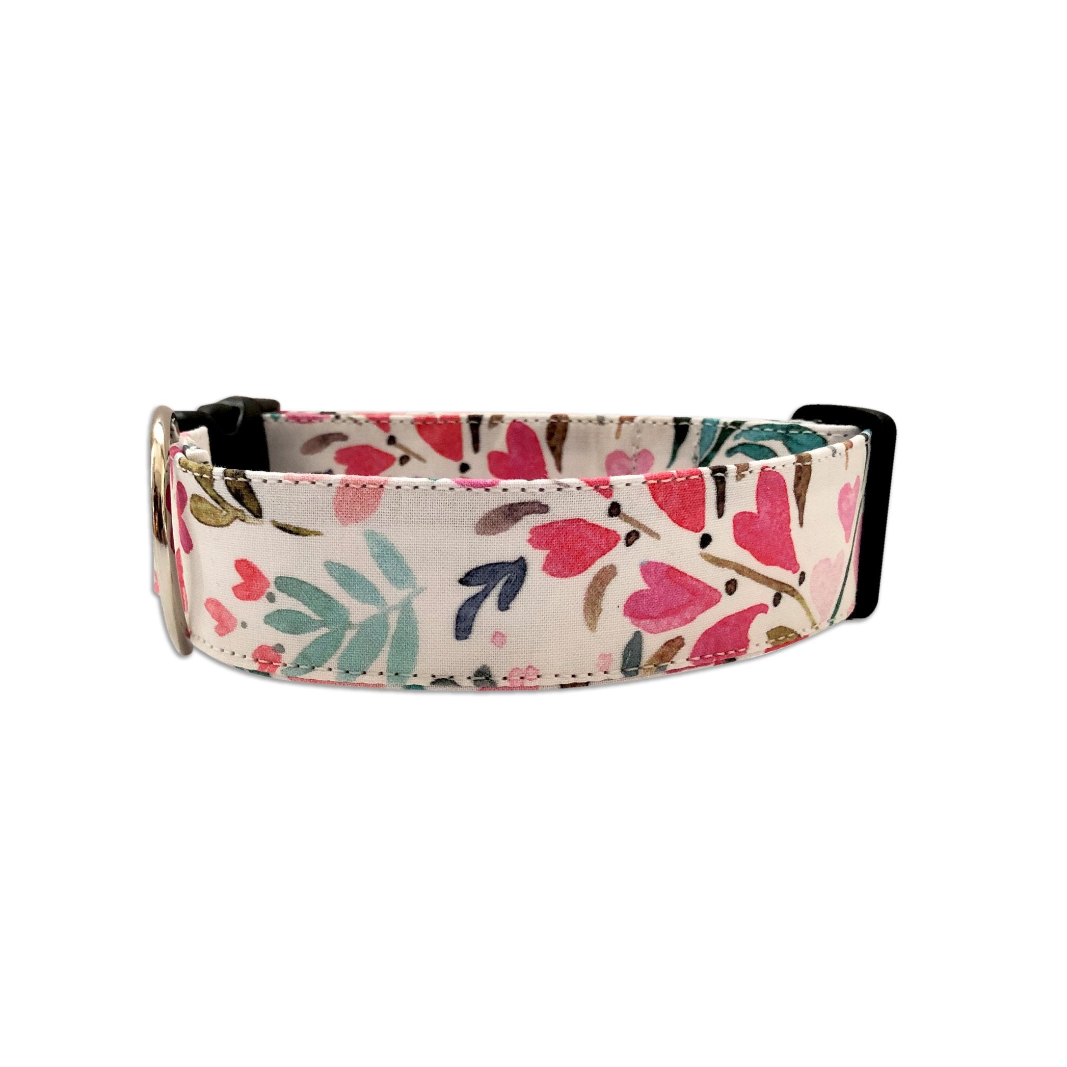 Martingales will be made in matching material and are slip on dog collars that are best suited for dogs that slip out of collars easily. When the dog pulls, the martingale tightens so the dog cannot escape. Martingale collars are intended to be used while on walks and not left on unsupervised.