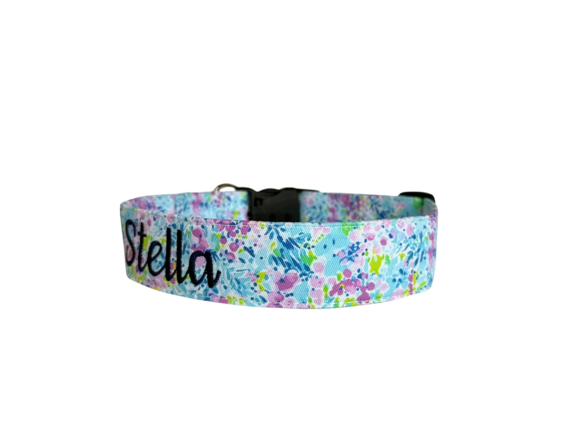 Light and lively, this personalized pastel splatter dog collar features a soft watercolor-inspired pattern in shades of blue, pink, and green. A playful, artsy collar designed for pups who love a pop of color.